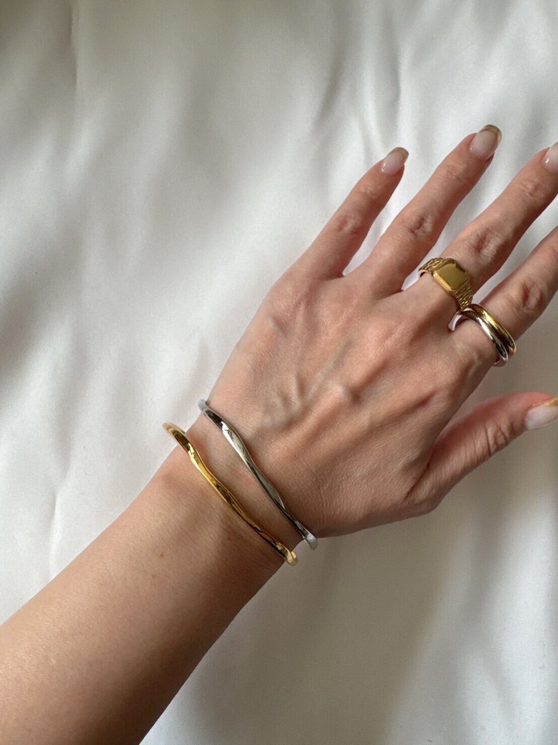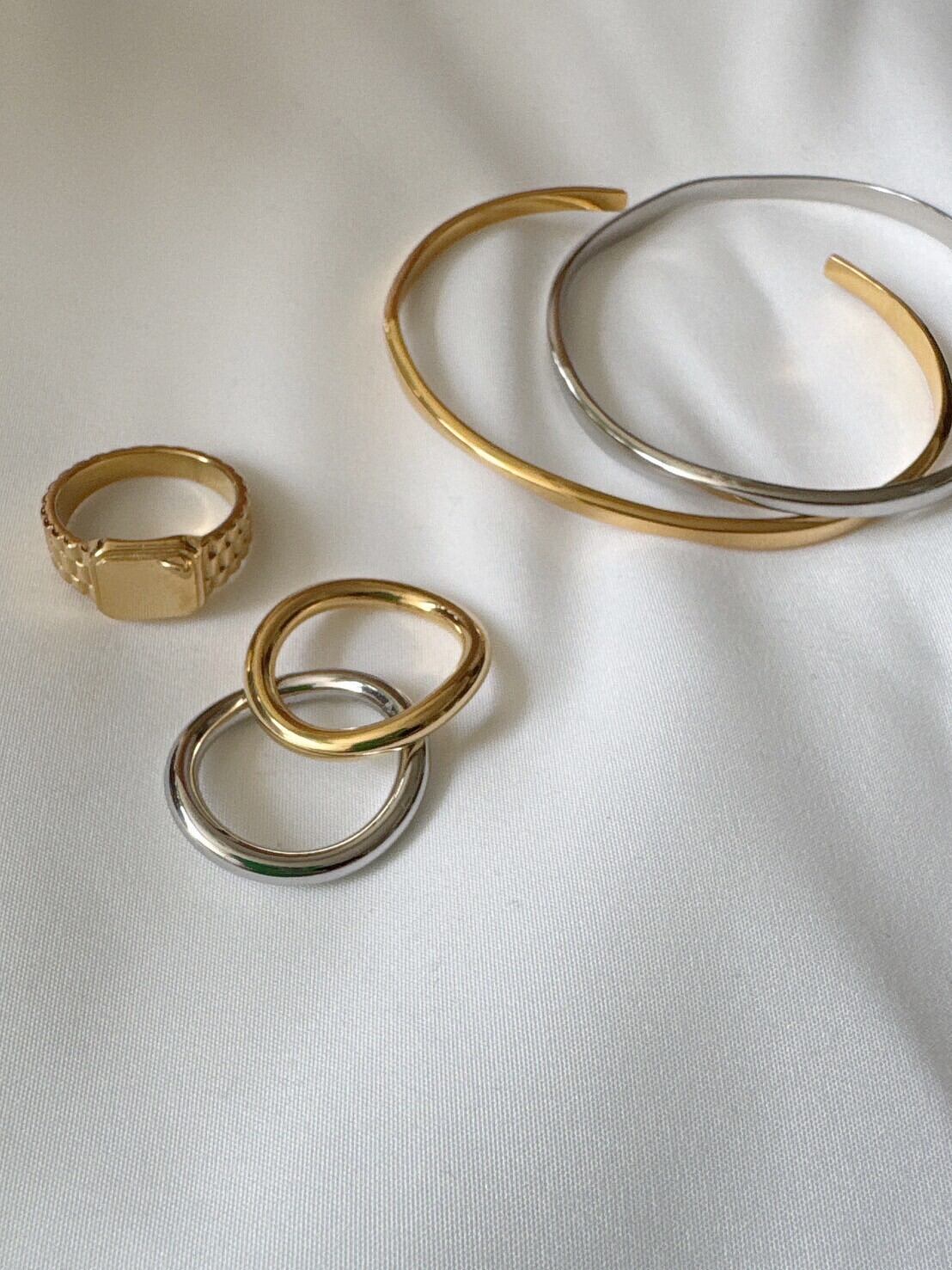 ゴールドとシルバー、異なる輝きが手元に洗練されたアクセントを添える「デュアルリング」。滑らかなフォルムと程よいボリューム感が魅力の、2本セットのリングです。