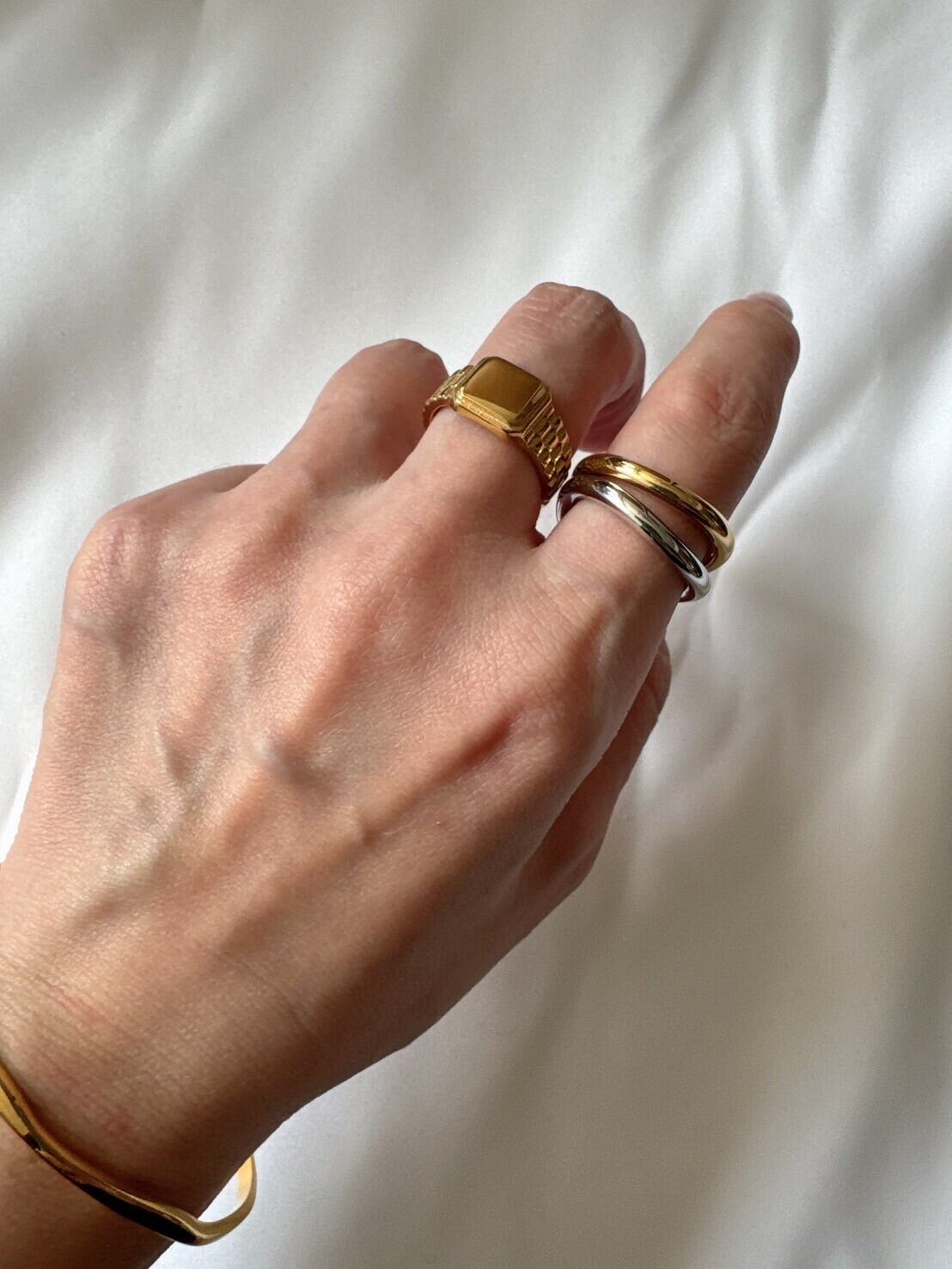 単体でシンプルに着けるのはもちろん、重ね付けや別の指に分けて着けることで、自由自在なスタイリングが楽しめます。カラーのコントラストが手元を引き立て、カジュアルからモードまで幅広いコーディネートにフィット。