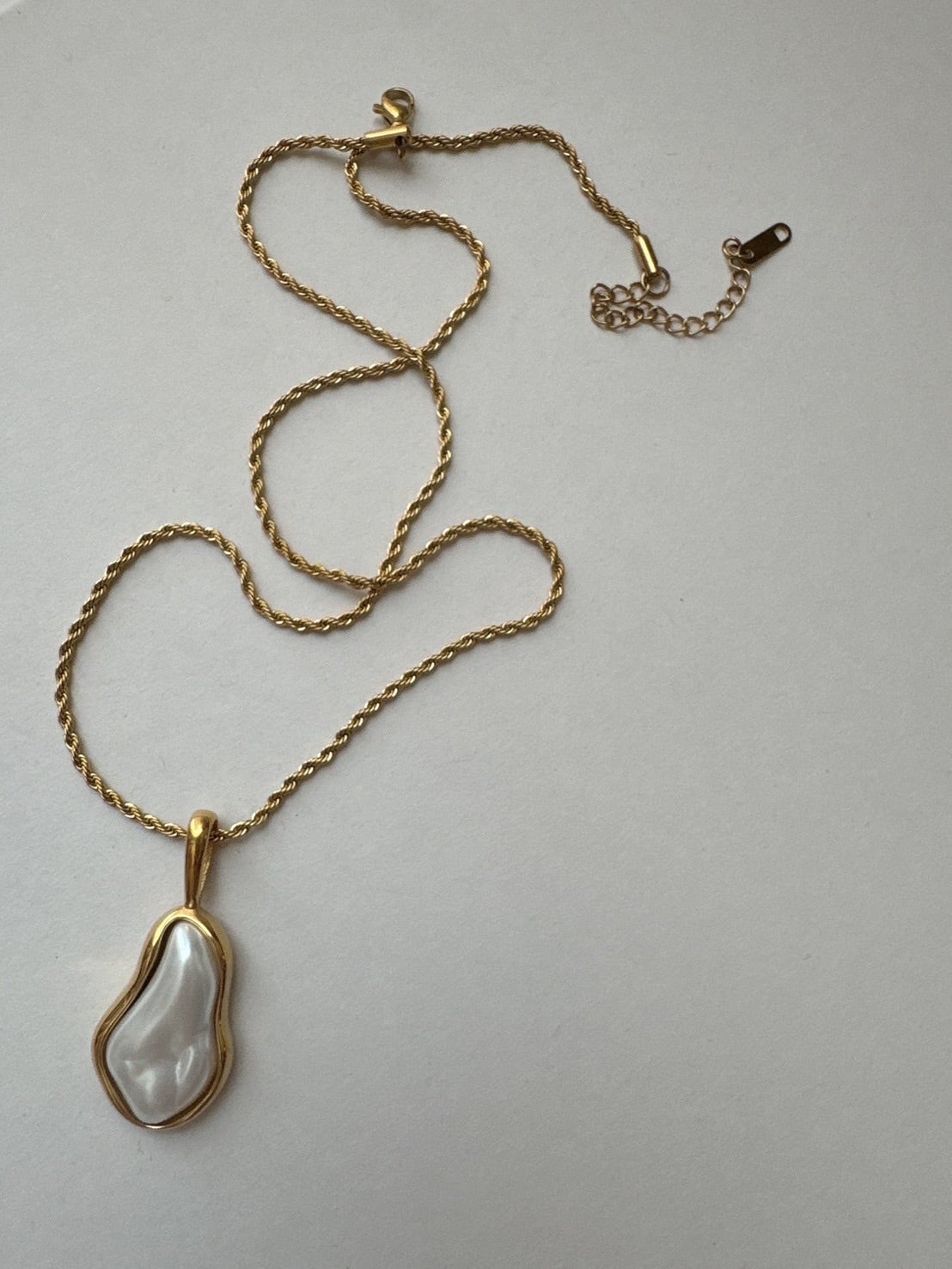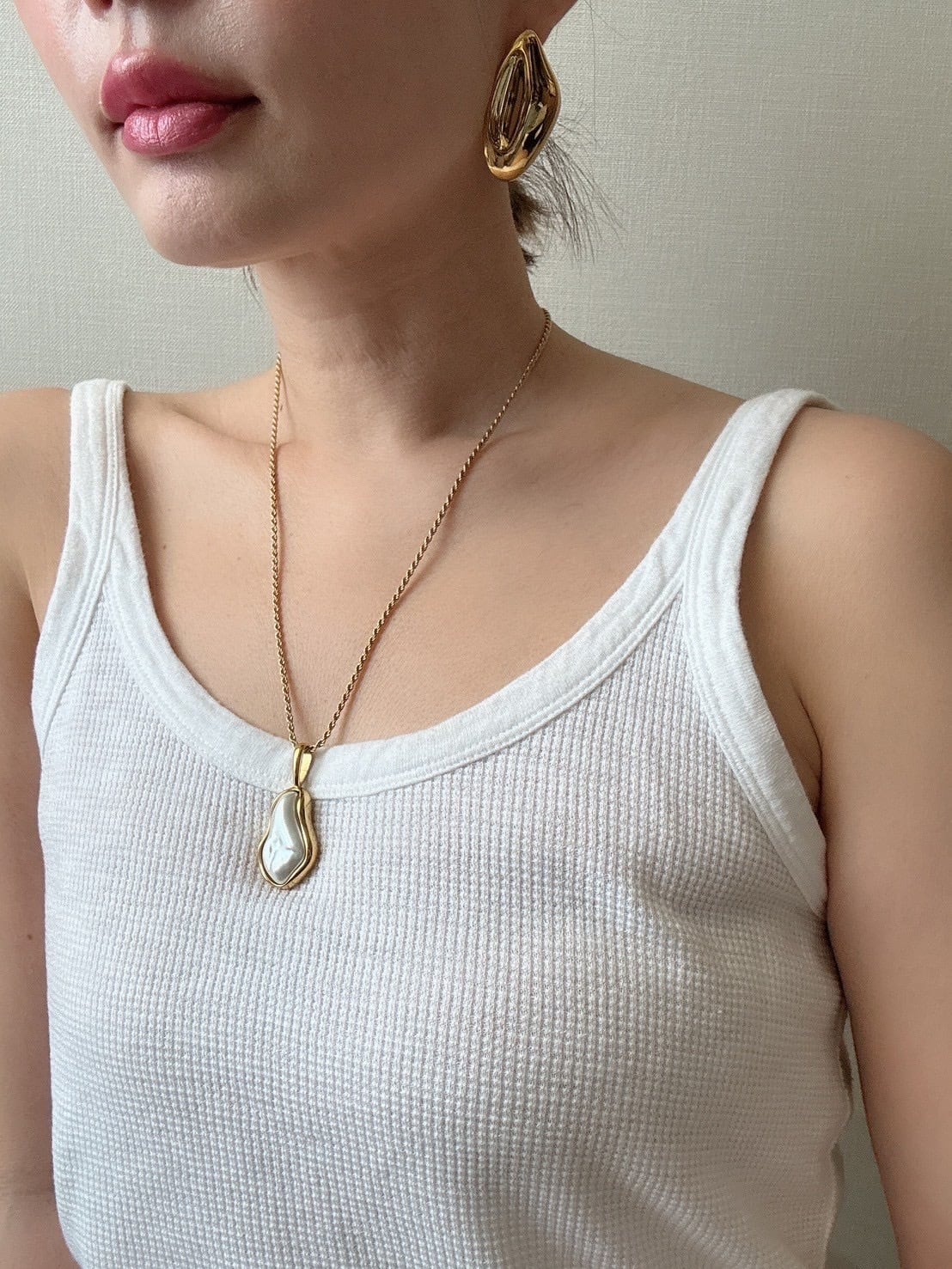 艶やかなホワイトと温もりのあるゴールドのコントラストが、胸元に上品な存在感をもたらします。長めのチェーンはシンプルなトップスにも映え、カジュアルからドレススタイルまで幅広く活躍。デコルテラインを美しく引き立てるだけでなく、身に着ける人の雰囲気を柔らかく、そして凛とした印象に仕上げます。