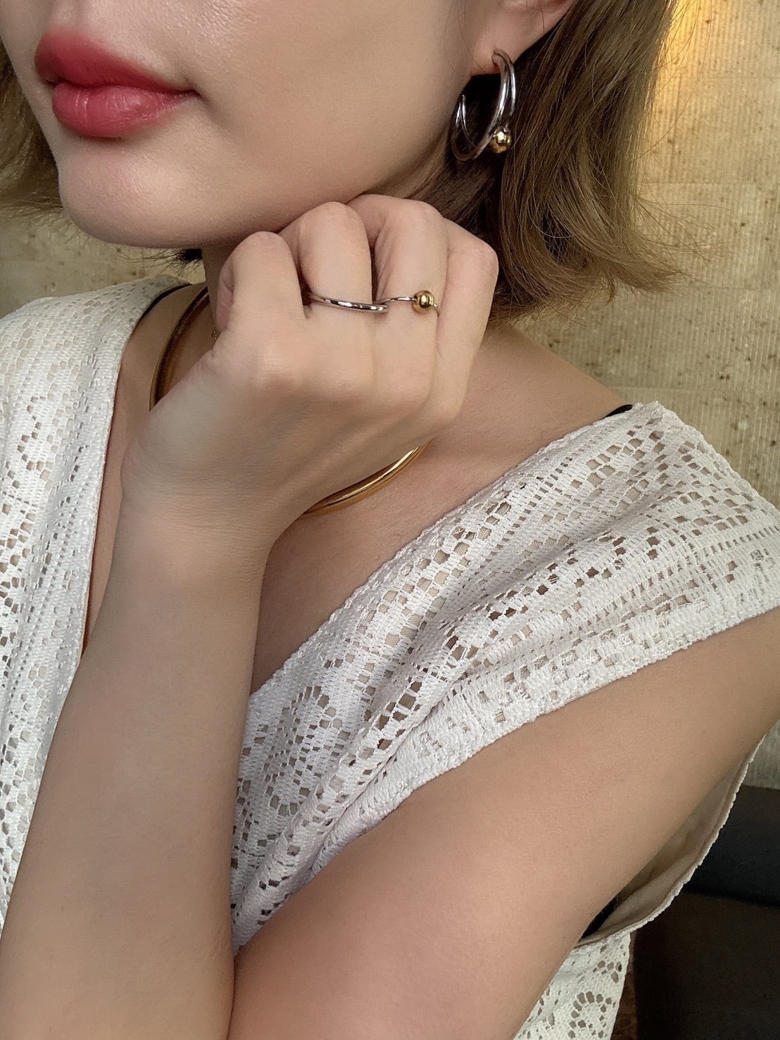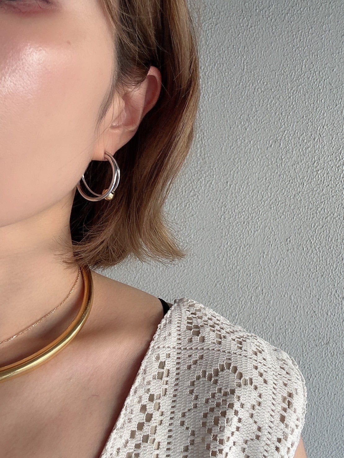 シルバーとゴールドのコントラストが、アクセサリーとしての存在感を高めながらも主張しすぎない絶妙なバランスを実現。シンプルでありながら個性を表現できる「デュアリティピアス」は、大人のスタイリングをワンランク格上げするアイテムです。