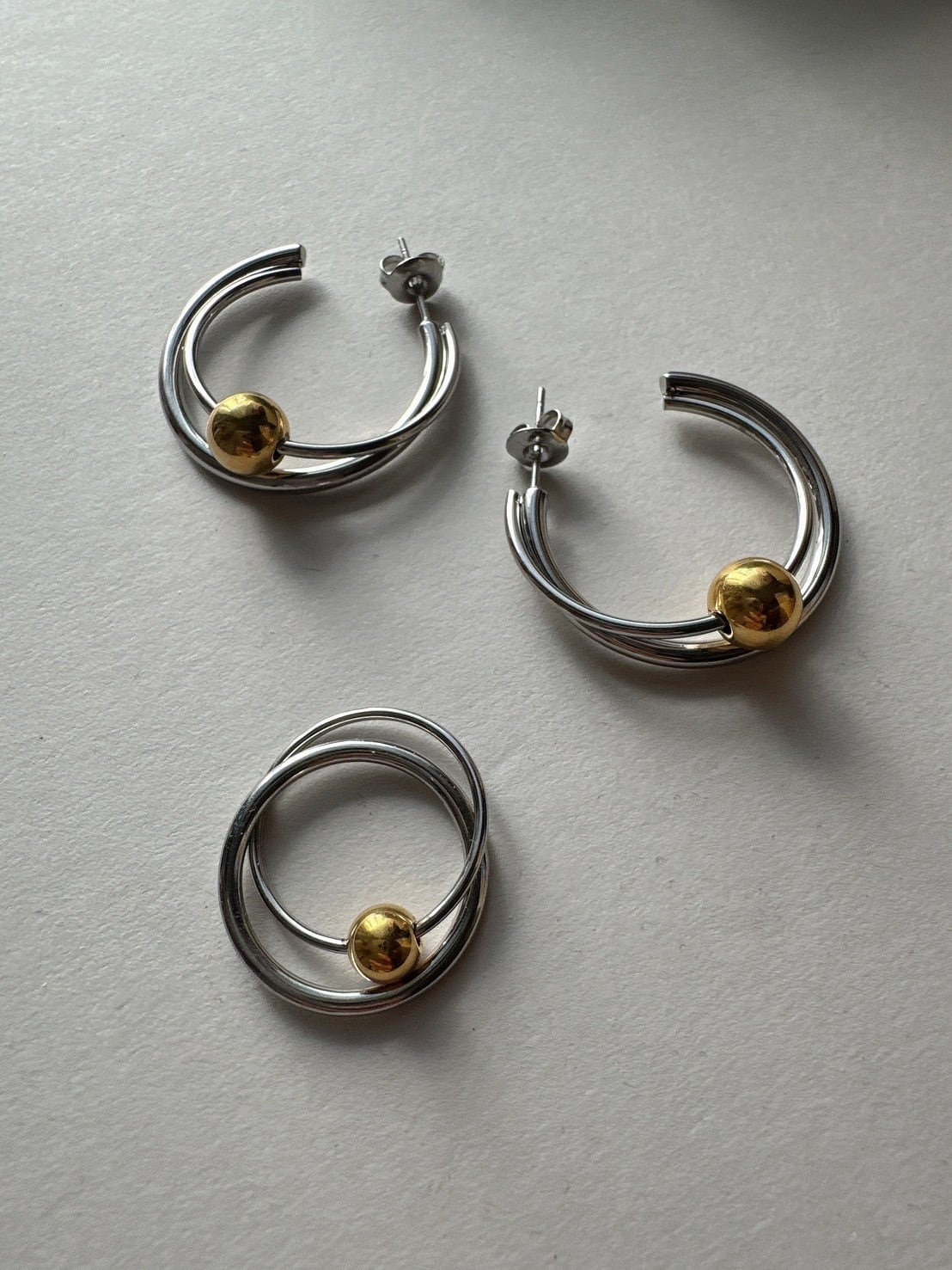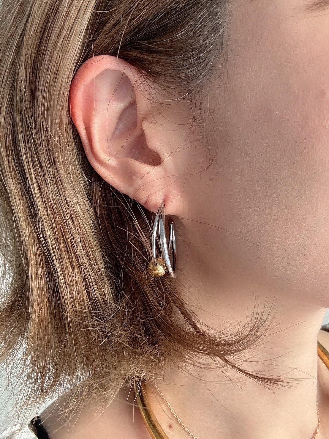 「デュアリティピアス」は、シルバーとゴールドが調和するモダンなデザインが魅力のフープピアスです。シャープな輝きを放つシルバーのフープに、存在感のあるゴールドのボールモチーフを添えることで、シンプルながらも印象的なアクセントをプラスしました。