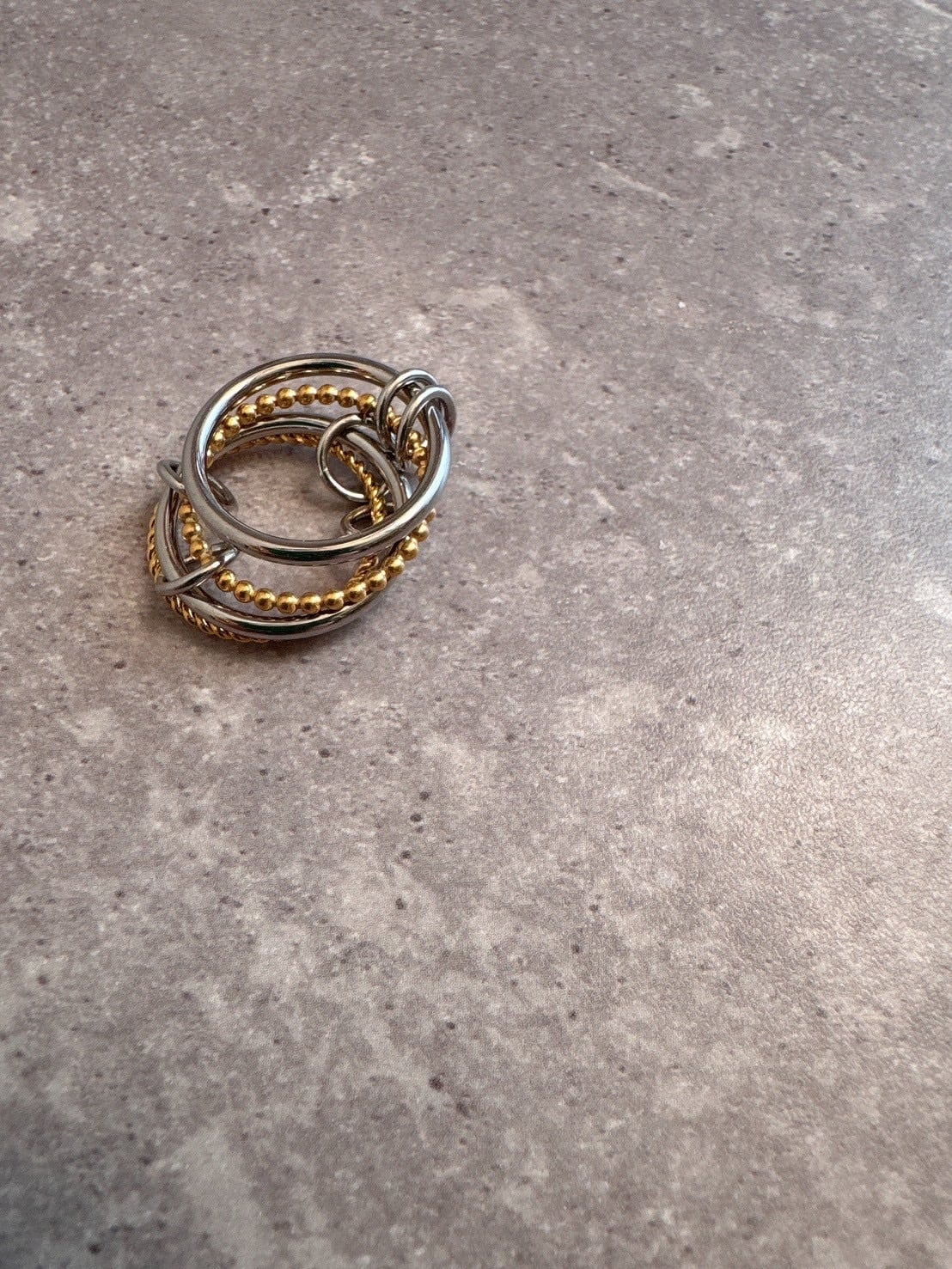 「4ラインリング」。シルバーとゴールドの異なる質感を巧みに組み合わせ、エッジの効いたモードな雰囲気と、どこか繊細で女性らしい柔らかさを同時に表現したデザインが魅力です。