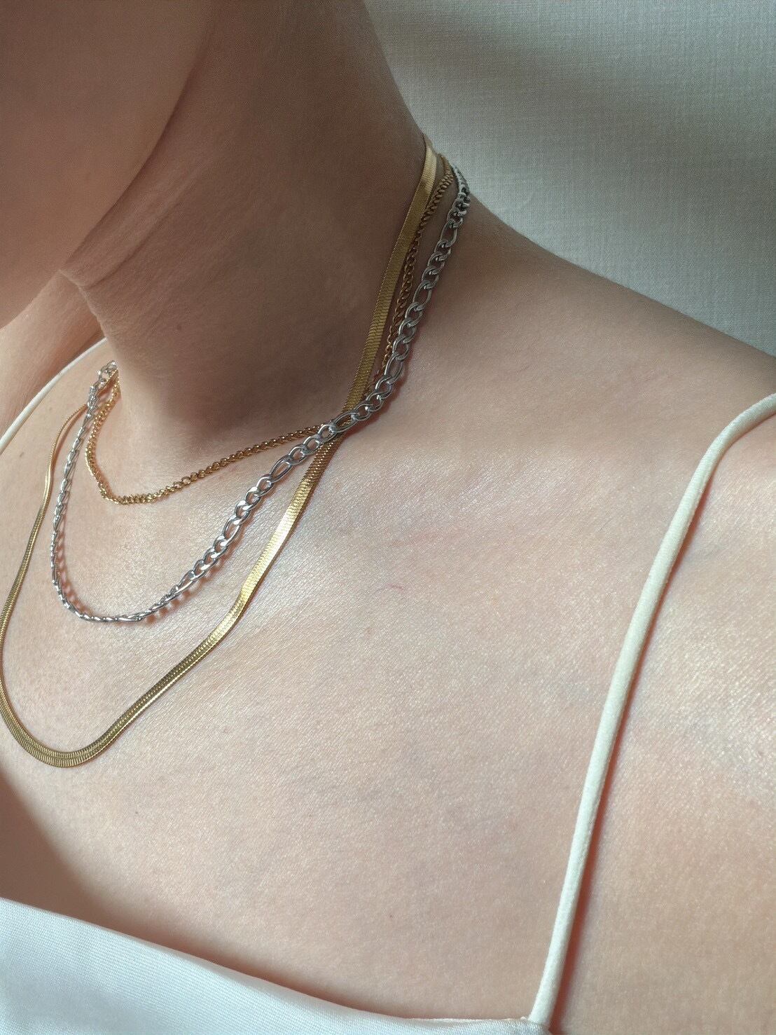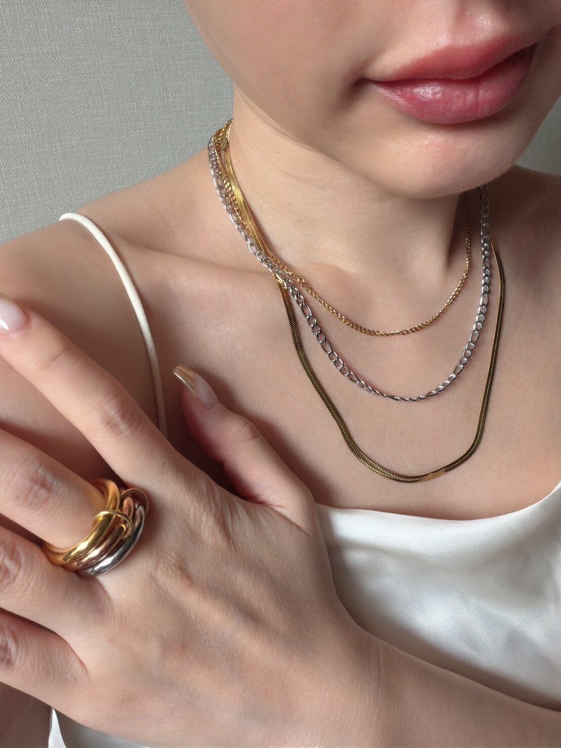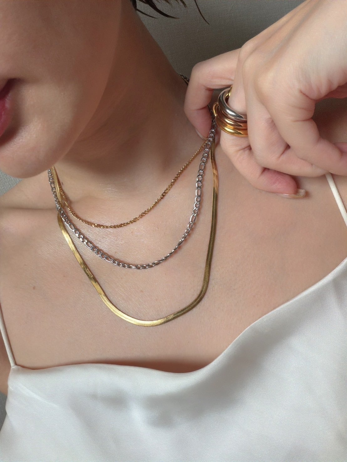 ゴールドとシルバーを絶妙に組み合わせた、存在感と上品さを兼ね備えた「レイヤードリュクスネックレス」。異なる質感と太さのチェーンを重ねることで、たった1本でレイヤードスタイルが完成するデザインです。