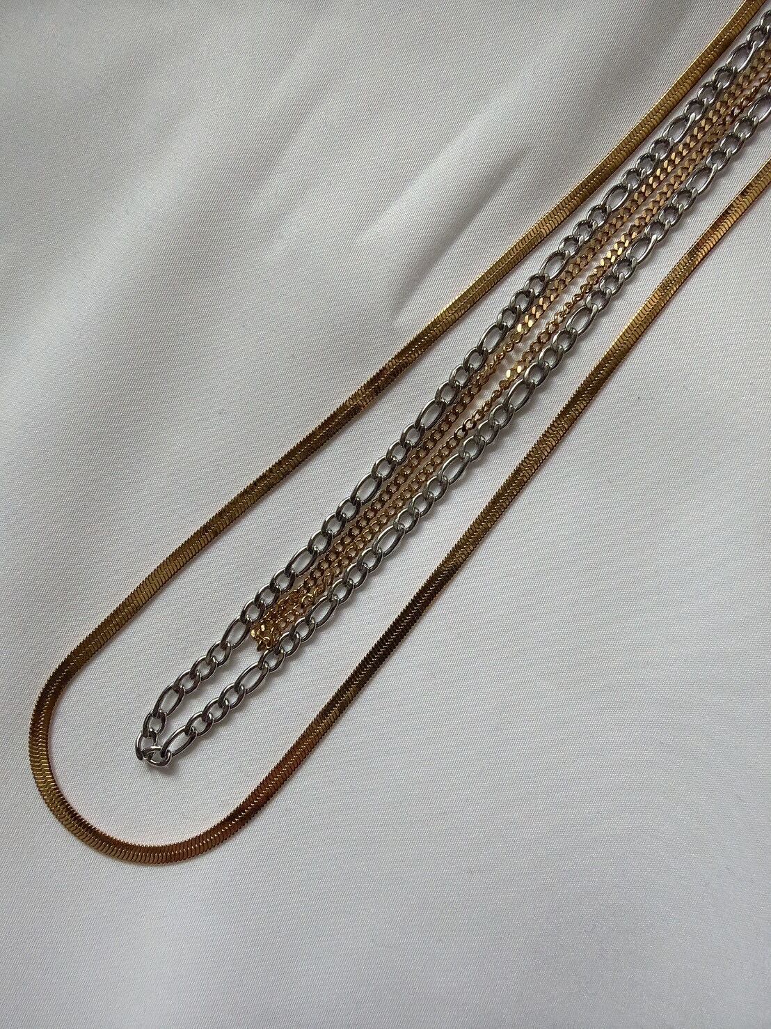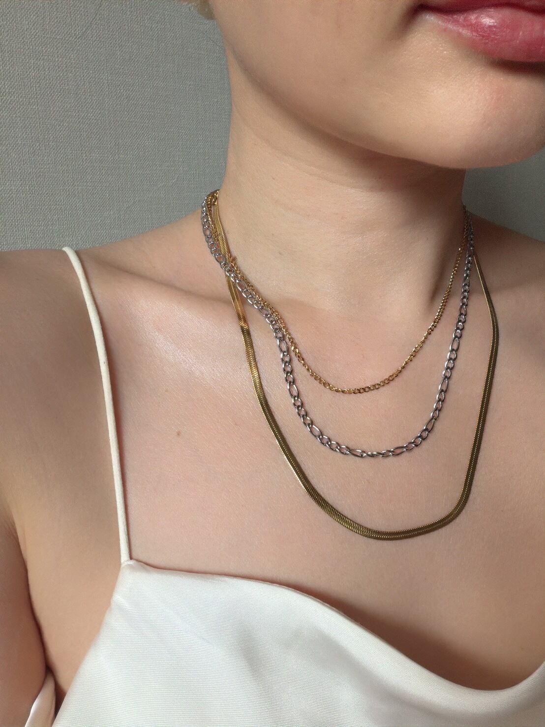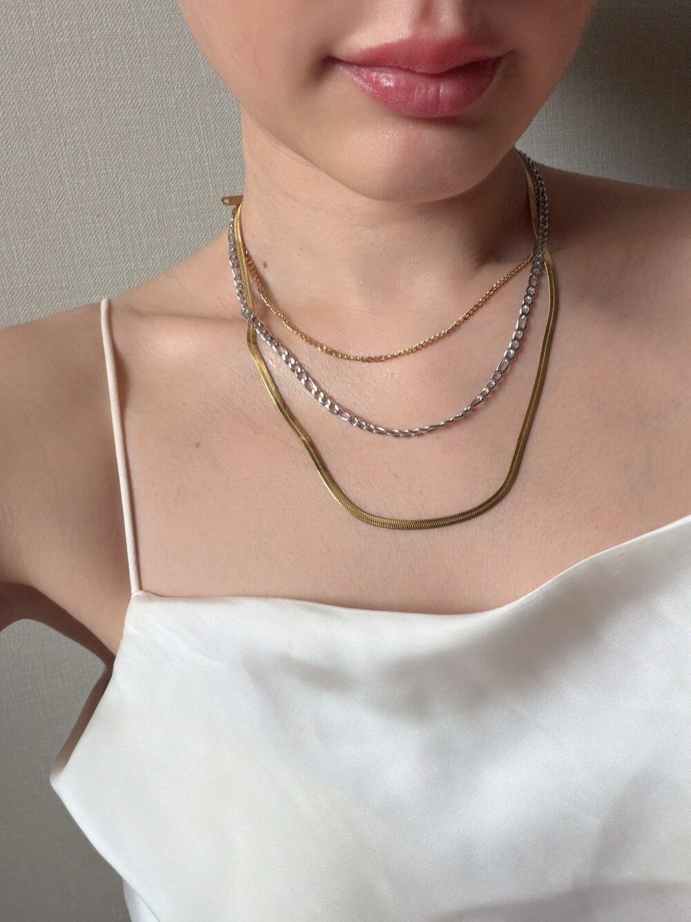 ゴールドとシルバーを絶妙に組み合わせた、存在感と上品さを兼ね備えた「レイヤードリュクスネックレス」。異なる質感と太さのチェーンを重ねることで、たった1本でレイヤードスタイルが完成するデザインです。