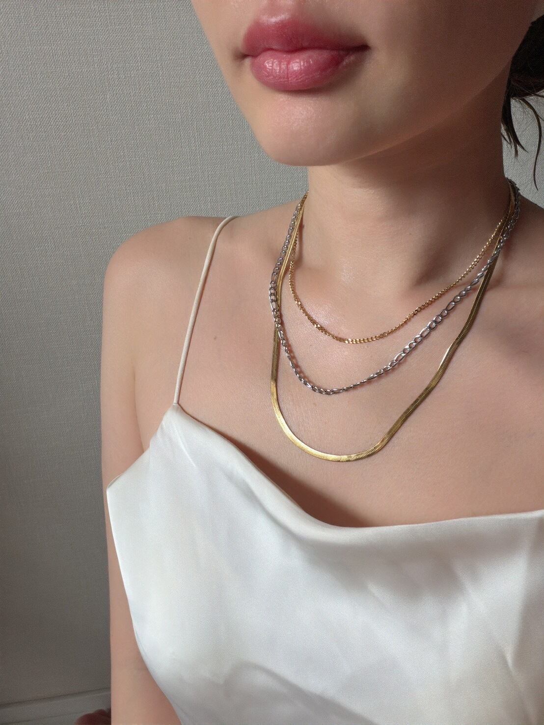 細めのチェーンが首元に繊細なきらめきを与え、存在感のあるゴールドのフラットチェーンがラグジュアリーな印象をプラス。シンプルなトップスに合わせるだけで、こなれ感と華やかさを演出します。