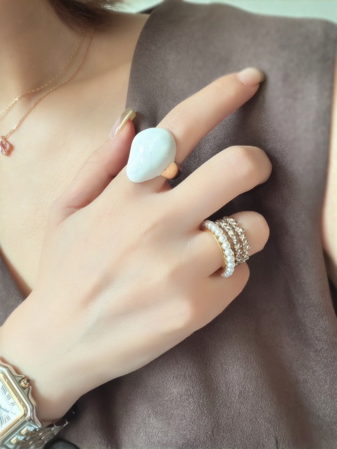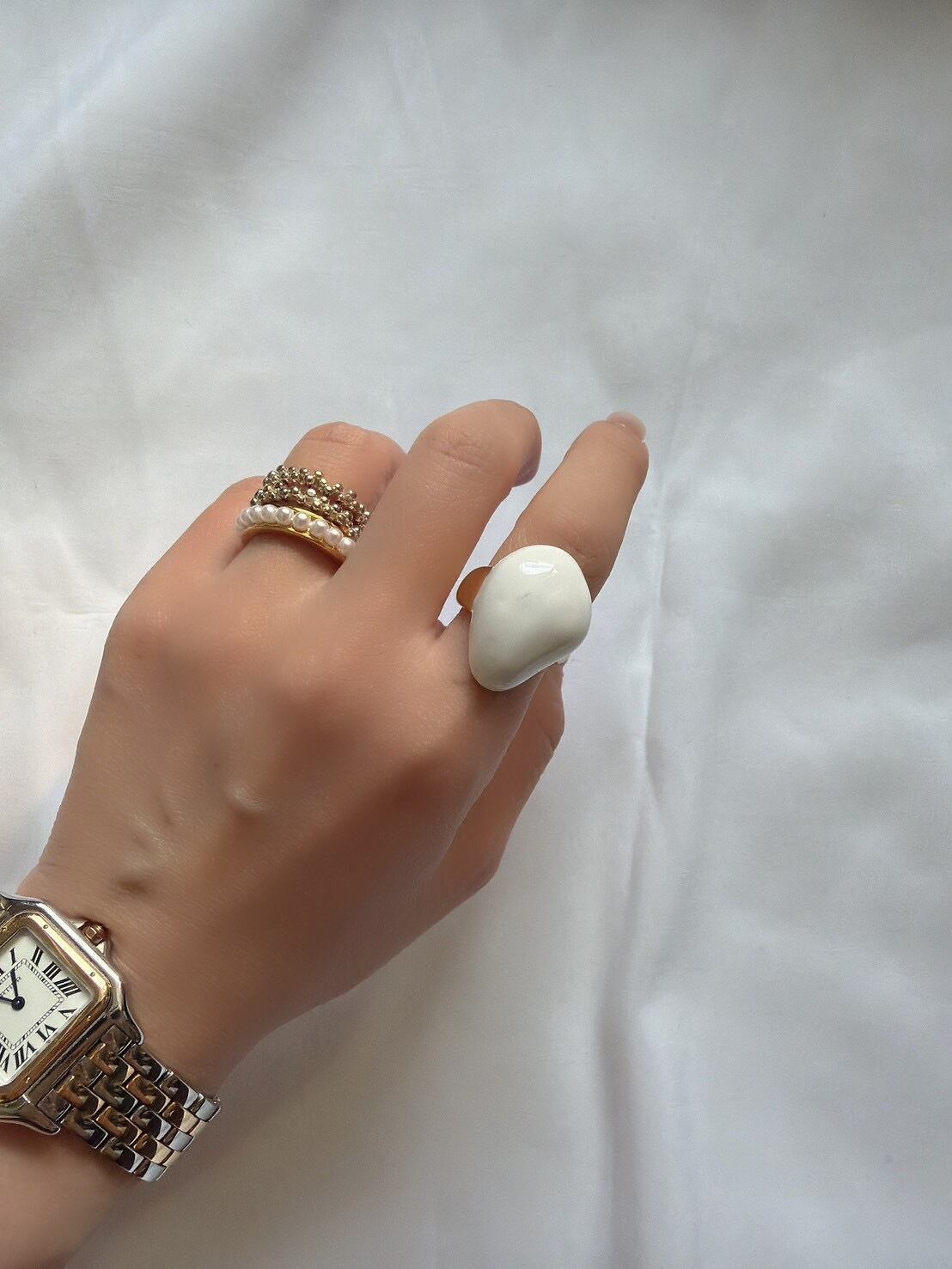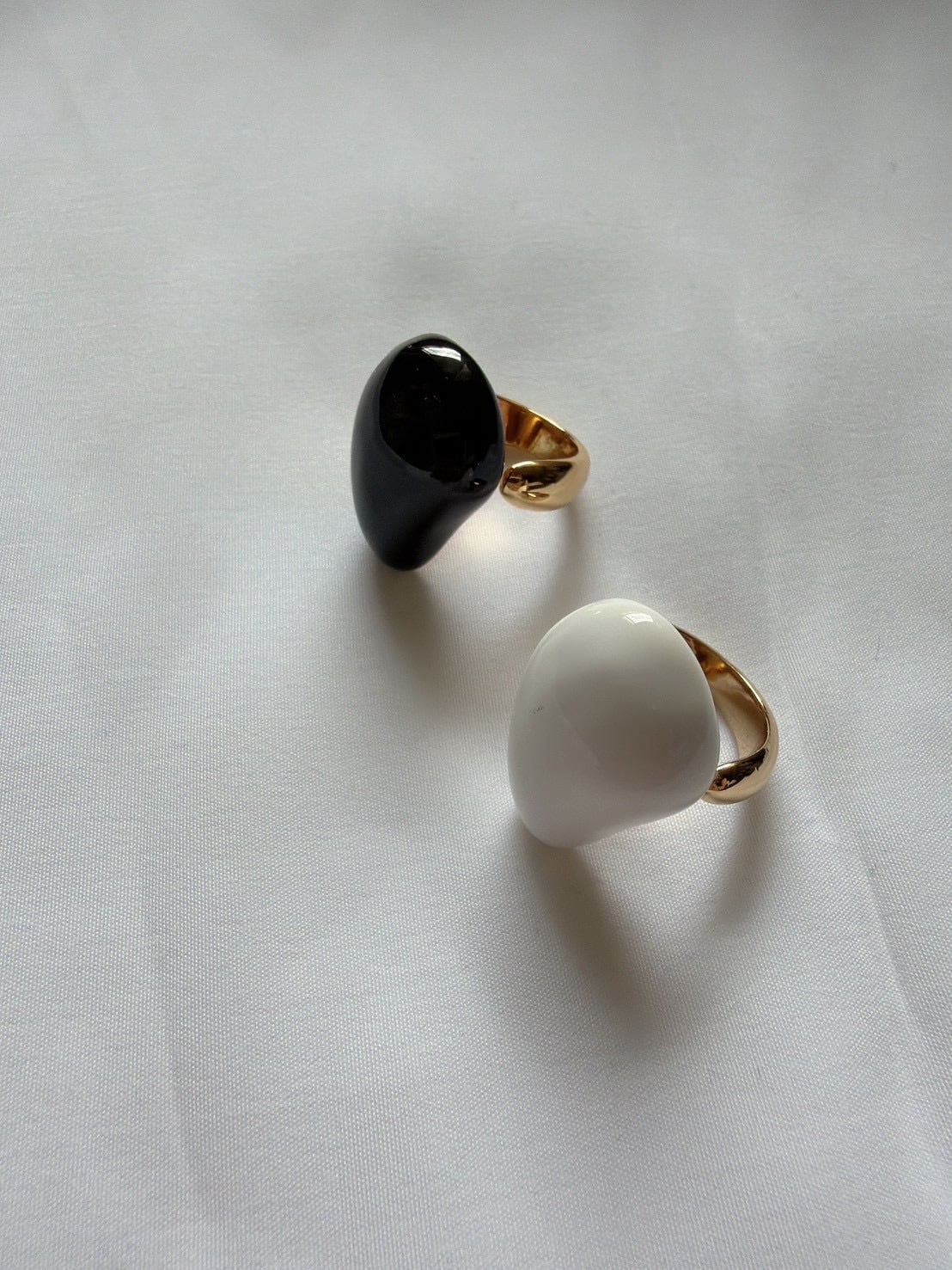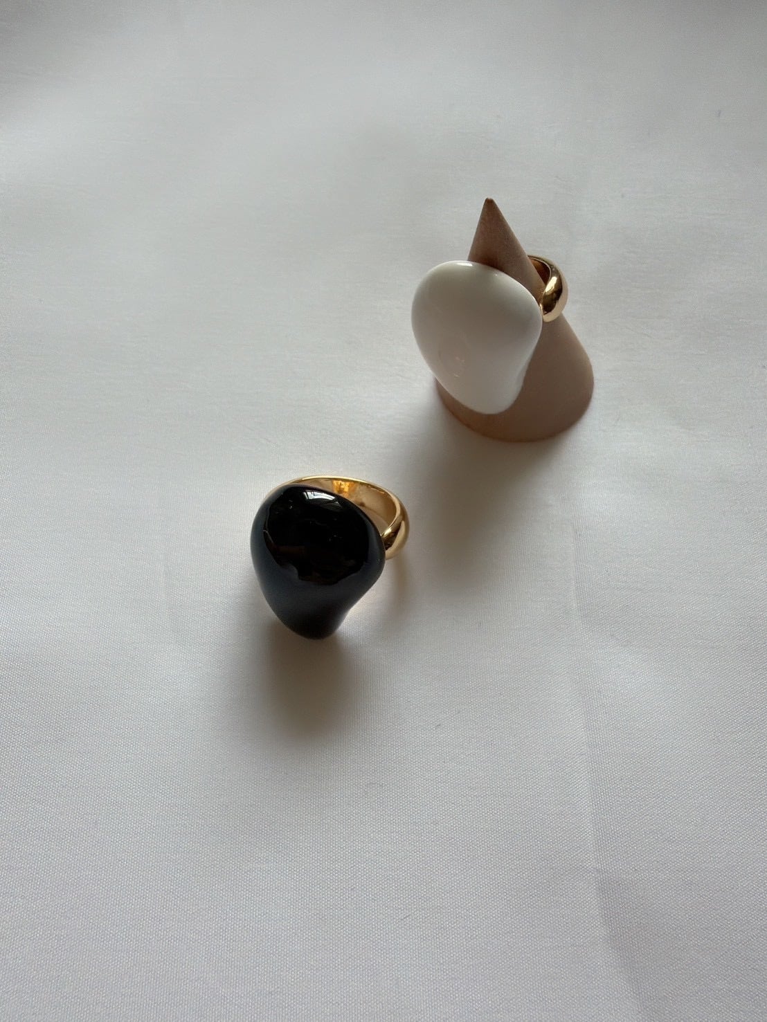 モードな雰囲気を演出する「ブラック」と、柔らかで上品な「ホワイト」の2カラー展開。どちらもエナメル特有の艶感が指先を美しく魅せ、季節やシーンを問わず活躍します。単品使いでスタイリッシュに仕上げるのはもちろん、他のリングと重ねづけしてもバランスよくまとまる万能アイテムです。