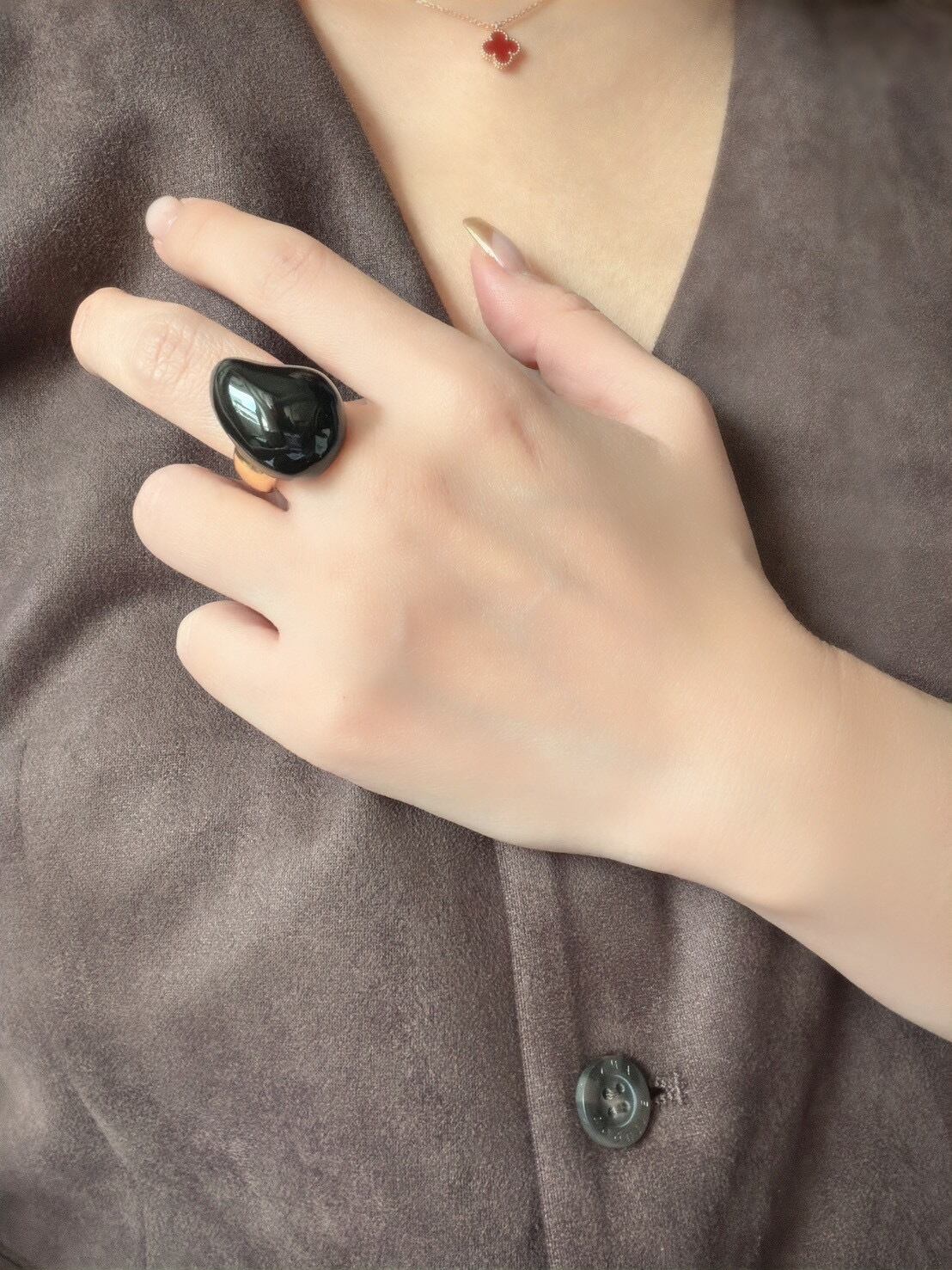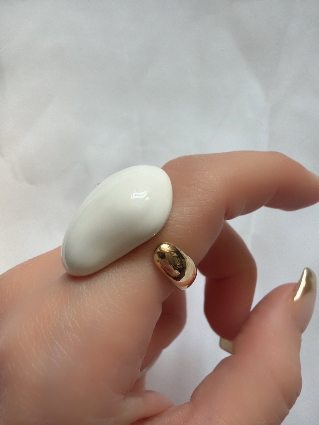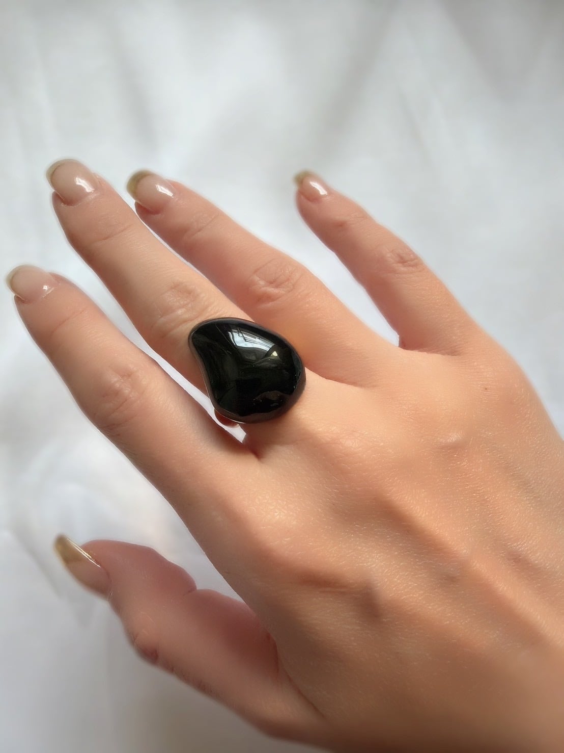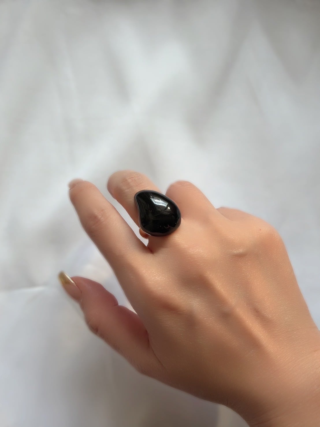 やわらかなフォルムと艶やかなエナメルの光沢が美しい「エナメルティアドロップリング」。名前の通り、指先に雫が落ちたような滑らかな曲線が印象的なデザインです。ミニマルながら存在感のあるフォルムで、シンプルなコーディネートに洗練されたアクセントを添えます。