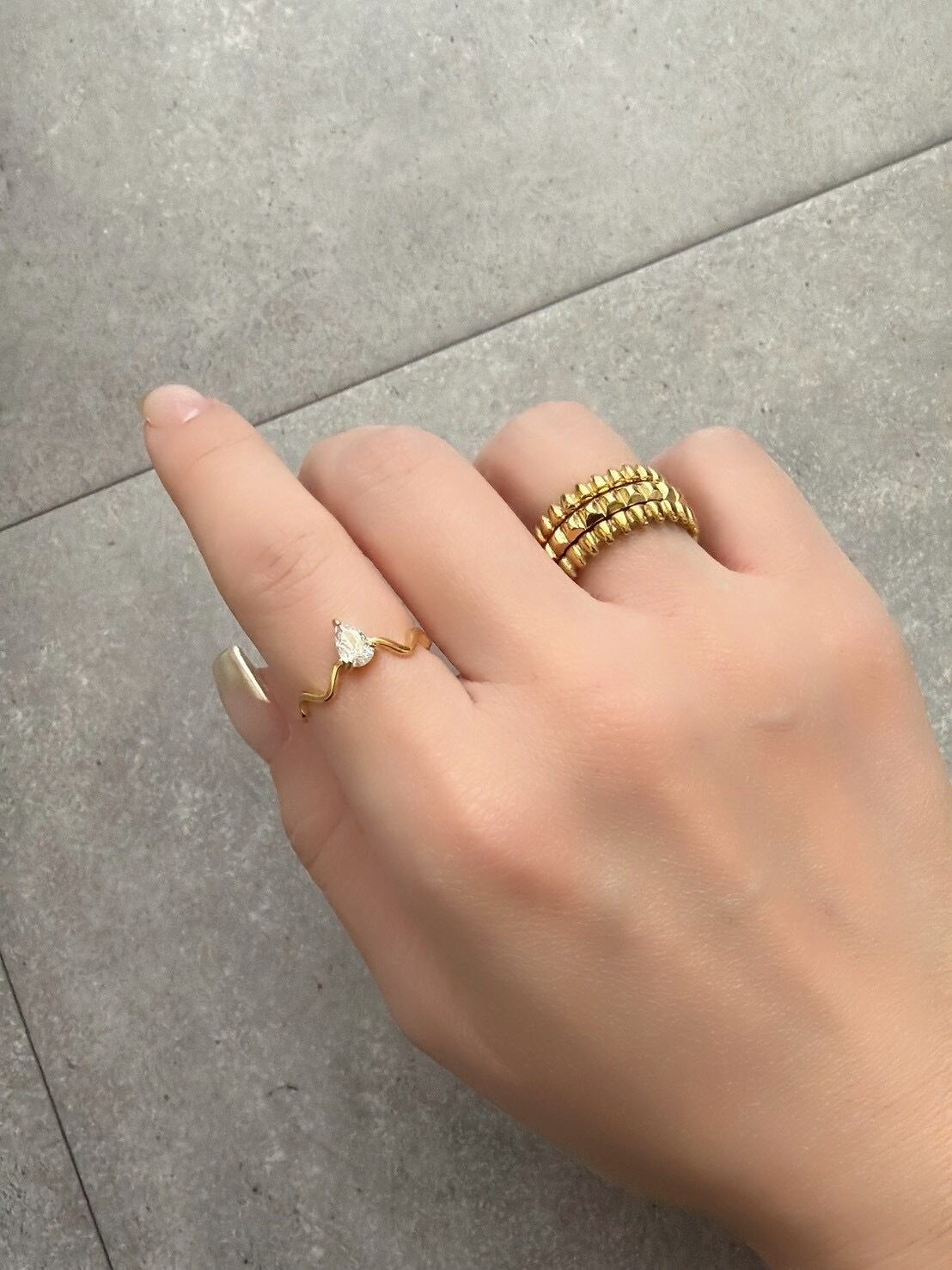 波打つようなシルエットが、柔らかく光を反射して手元を美しく演出。中心に添えられた涙型のストーンは、見る角度によってきらめきを変え、まるで感情のきらめきを映し出すかのよう。シンプルな中にも上品な個性を感じさせる仕上がりです。
