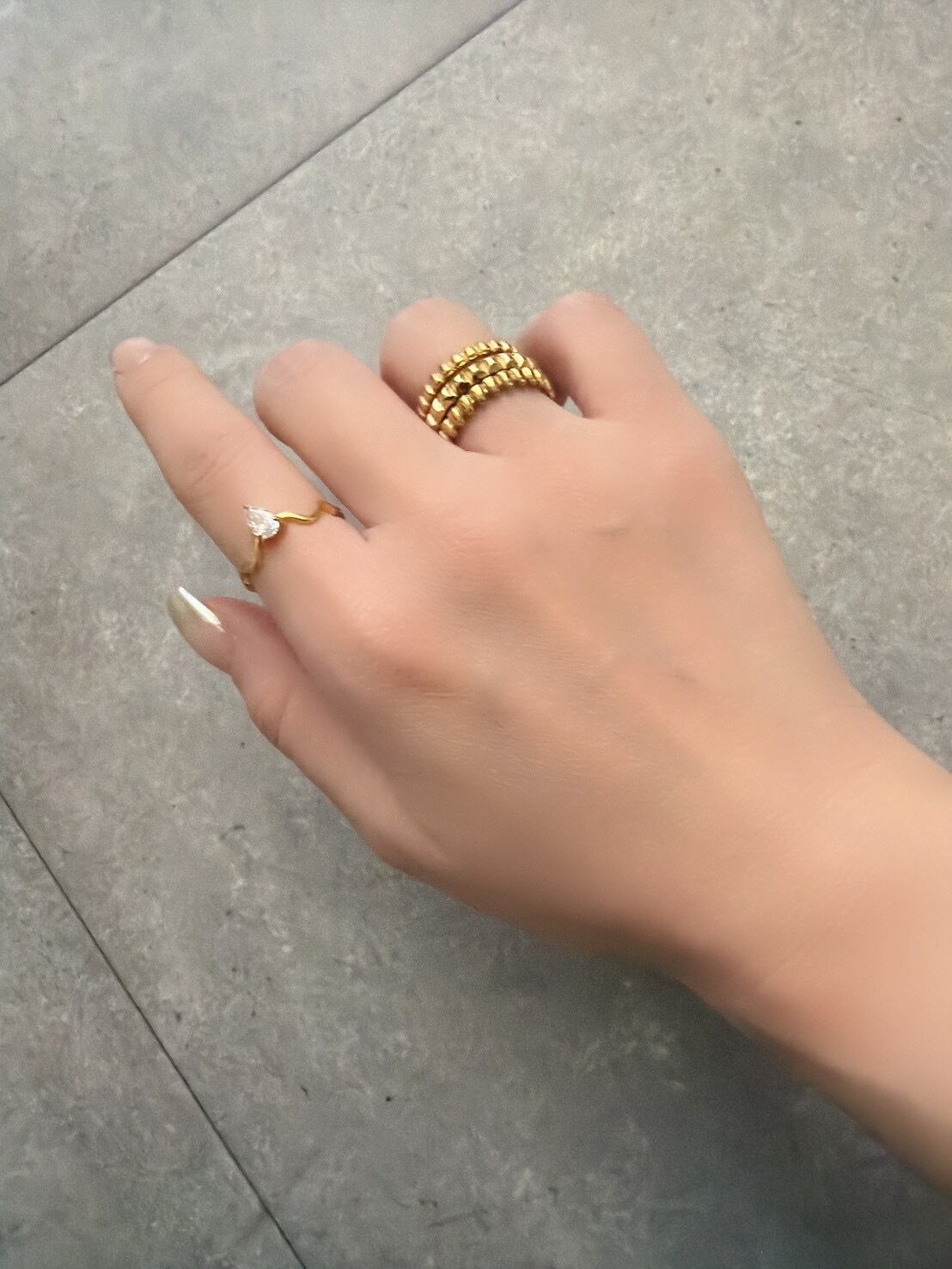 単品ではもちろん、他のリングとのレイヤードスタイルにも相性抜群。特にパールやデザインリングと組み合わせることで、手元に華やかさと抜け感をプラスします。デイリーから特別な日まで幅広く活躍し、どんなコーディネートにもさりげない品格を添えてくれるリングです。