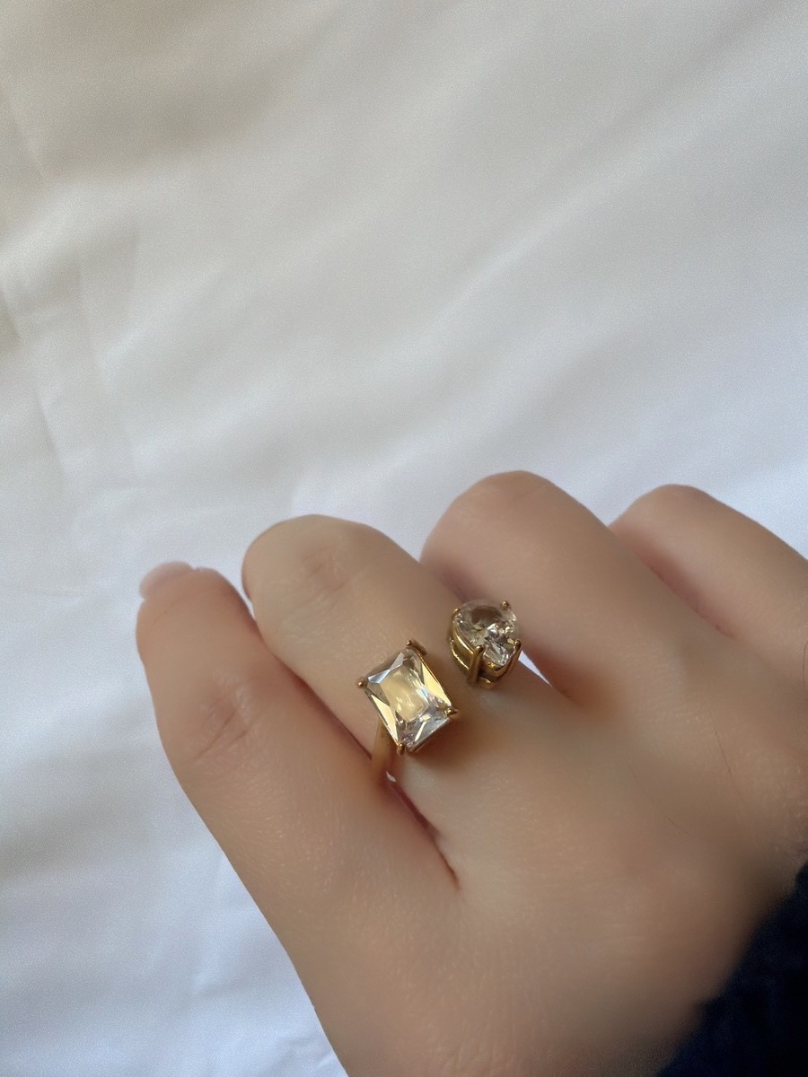 異なるフォルムの輝きを一つにまとめた、存在感あふれる「スクエアドロップコンビリング」。シャープな印象のスクエアカットと、やわらかな曲線が美しいドロップカットのストーンを並べて配置することで、モダンさと女性らしさを絶妙なバランスで表現しました。
