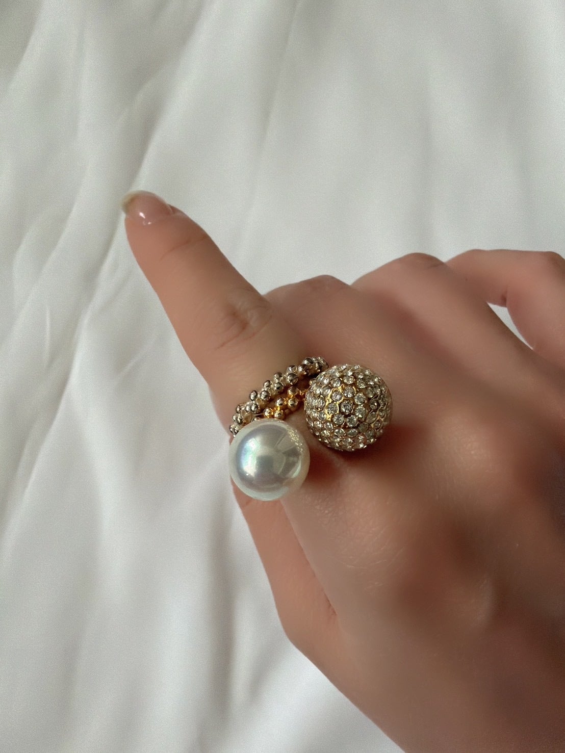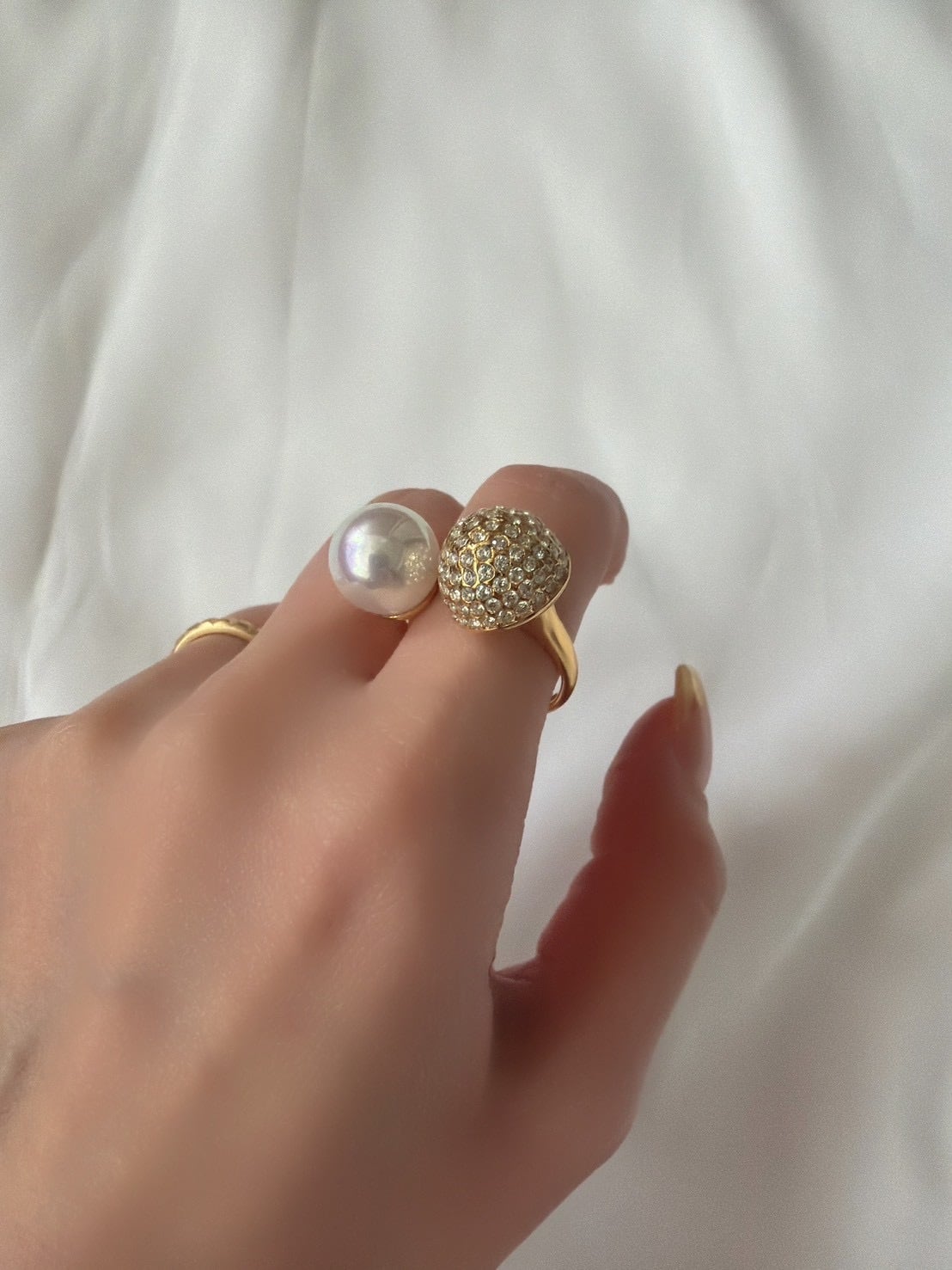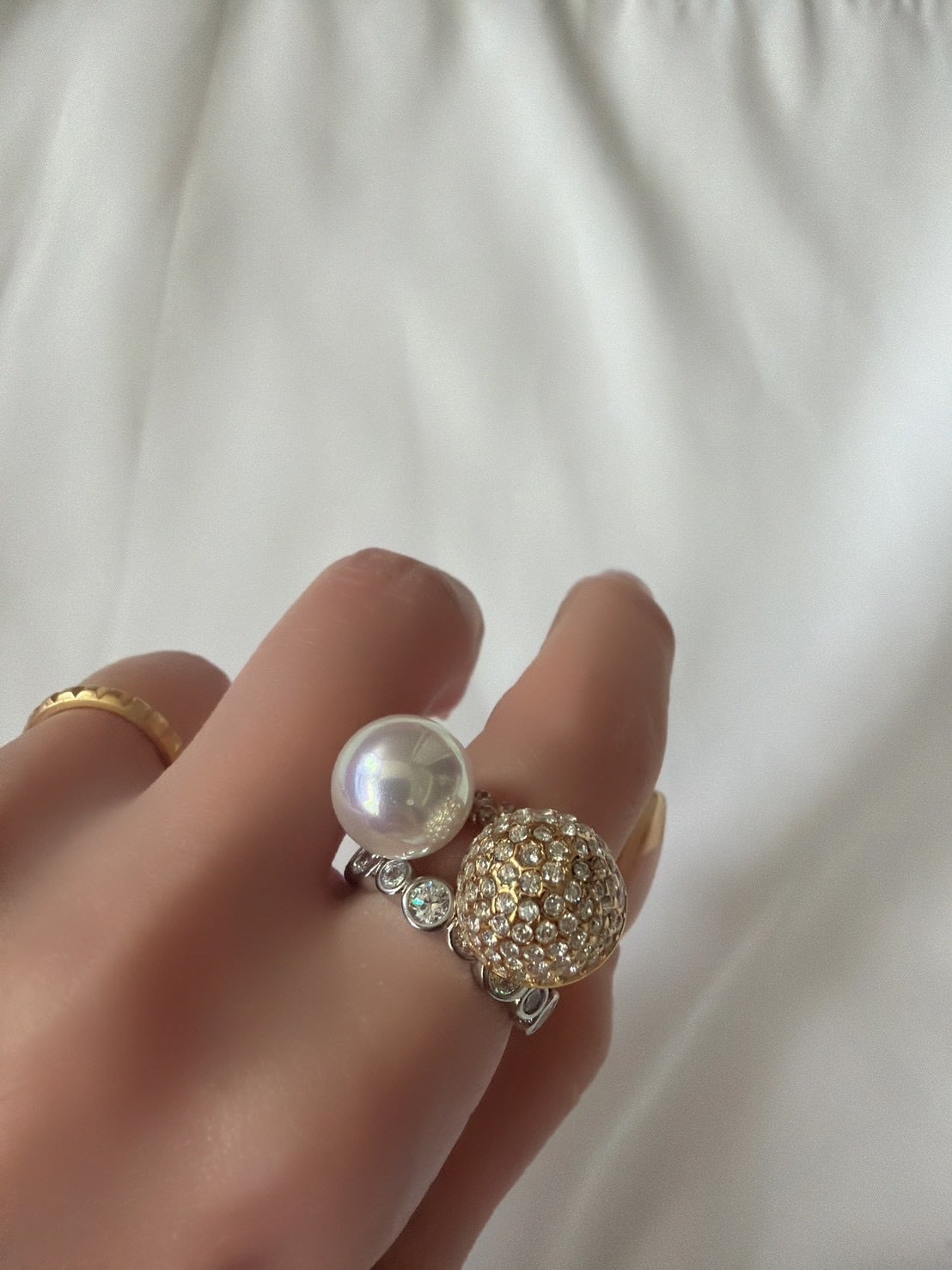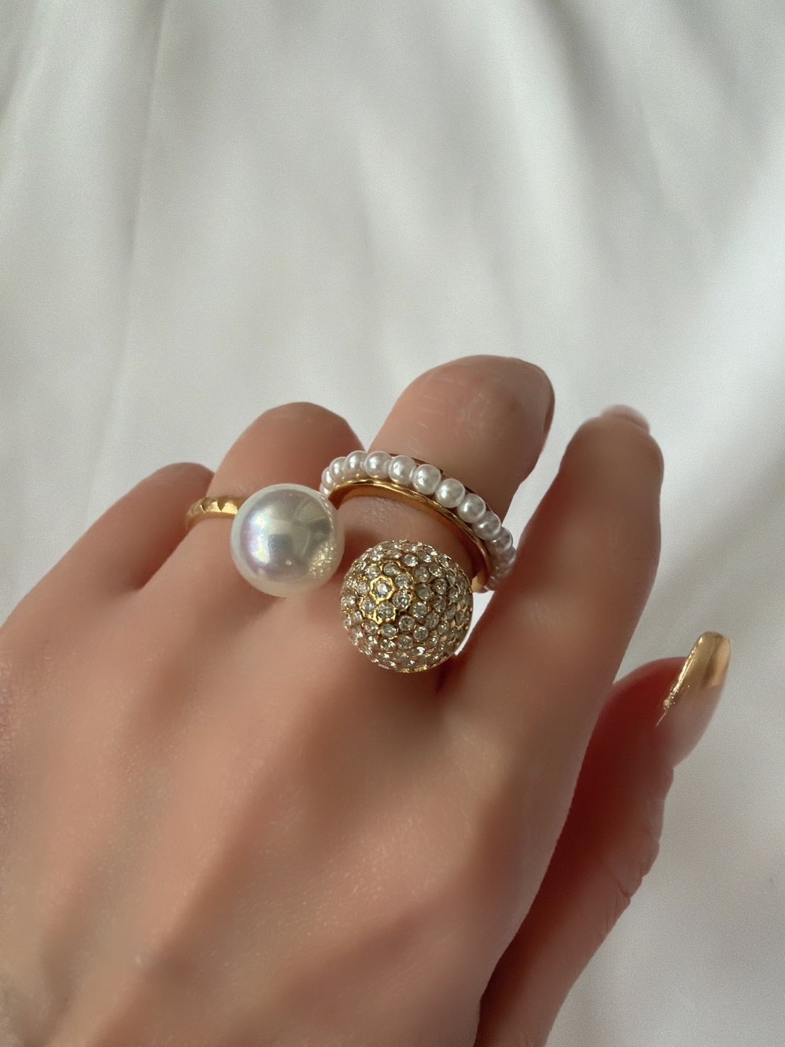 キラキラストーンとパールのダブルモチーフリング。上品な輝きと華やかさを同時に楽しめる「きらパールリング」。存在感のある艶やかなパールと、繊細に敷き詰められたストーンボールを組み合わせたデザインが、指元に洗練されたアクセントを添えます。