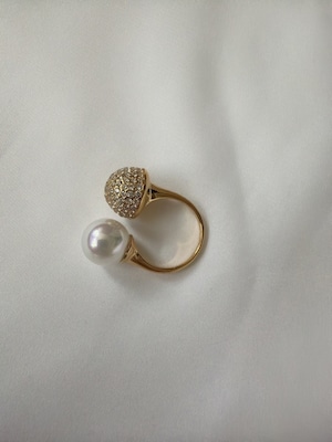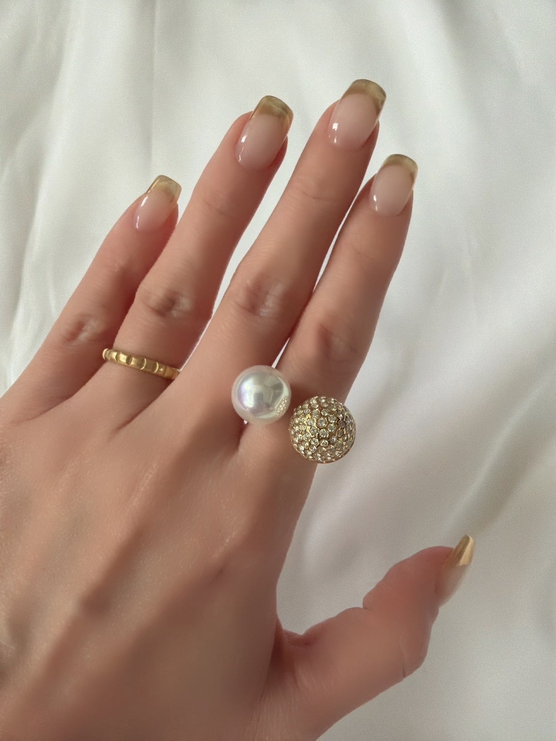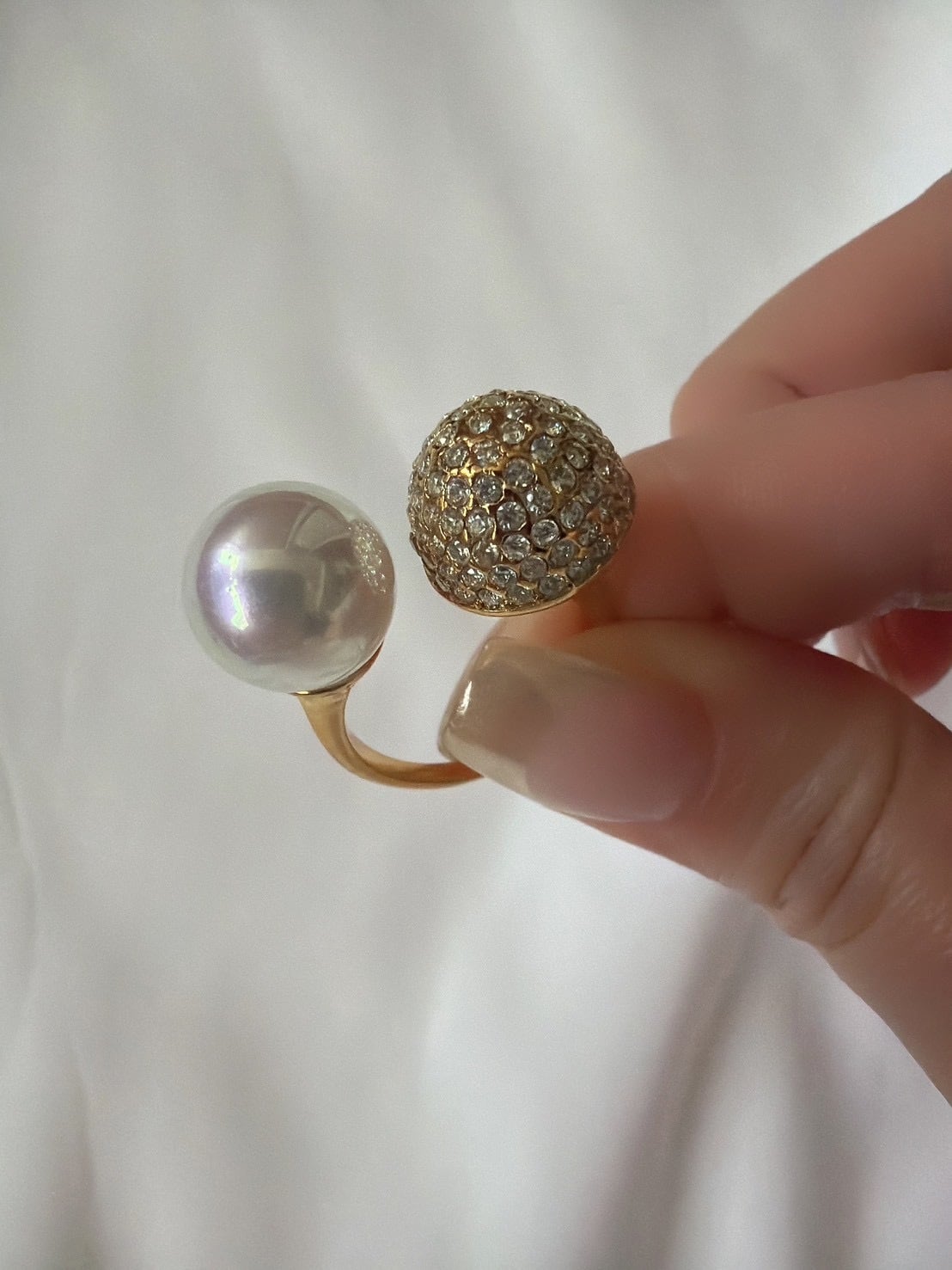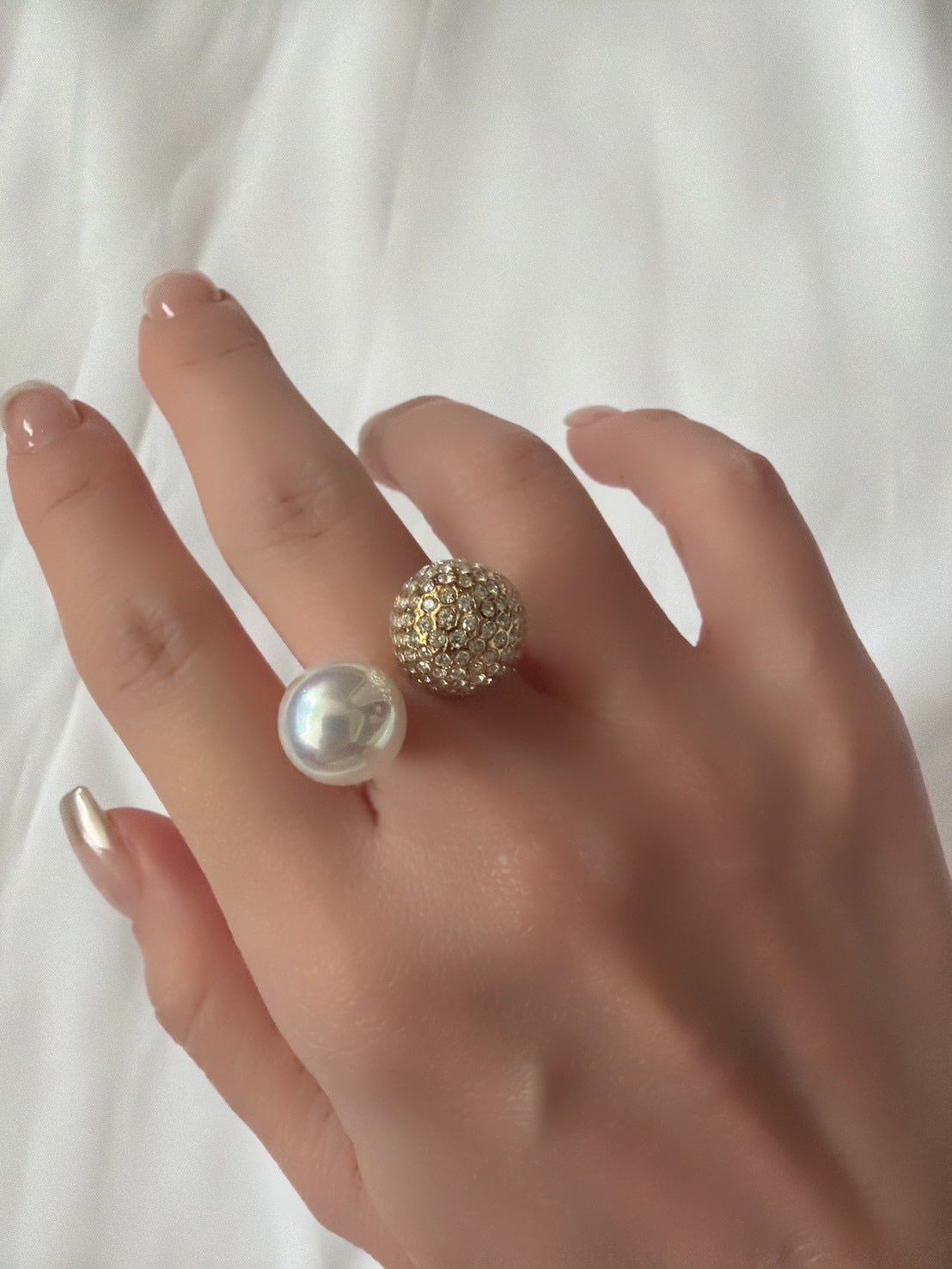 キラキラストーンとパールのダブルモチーフリング。上品な輝きと華やかさを同時に楽しめる「きらパールリング」。存在感のある艶やかなパールと、繊細に敷き詰められたストーンボールを組み合わせたデザインが、指元に洗練されたアクセントを添えます。