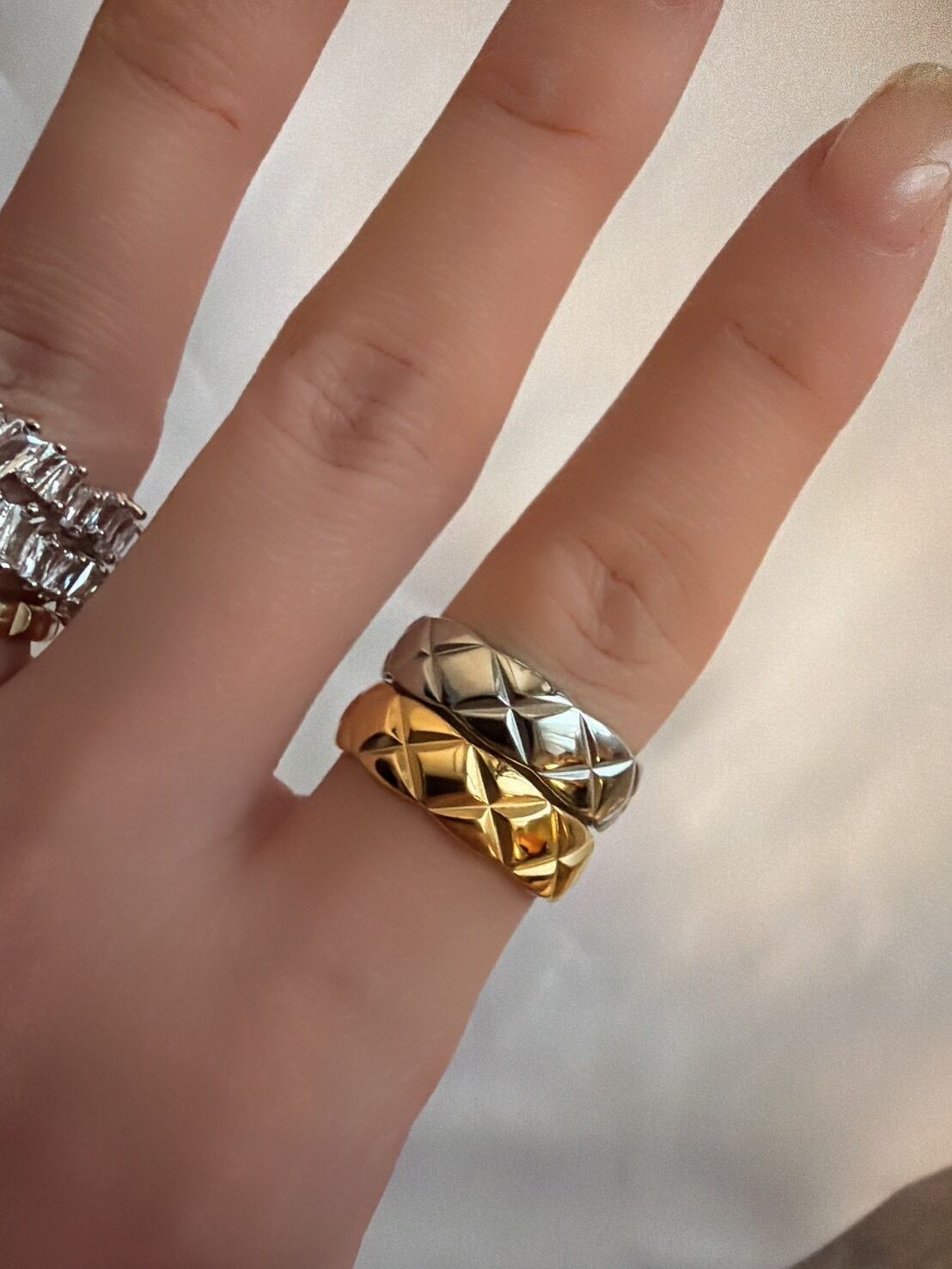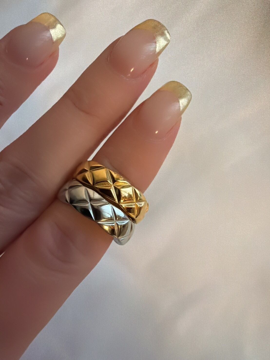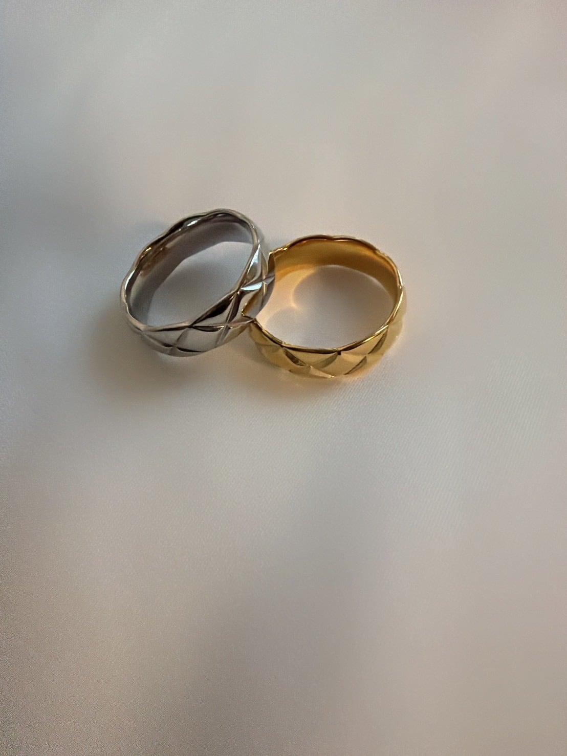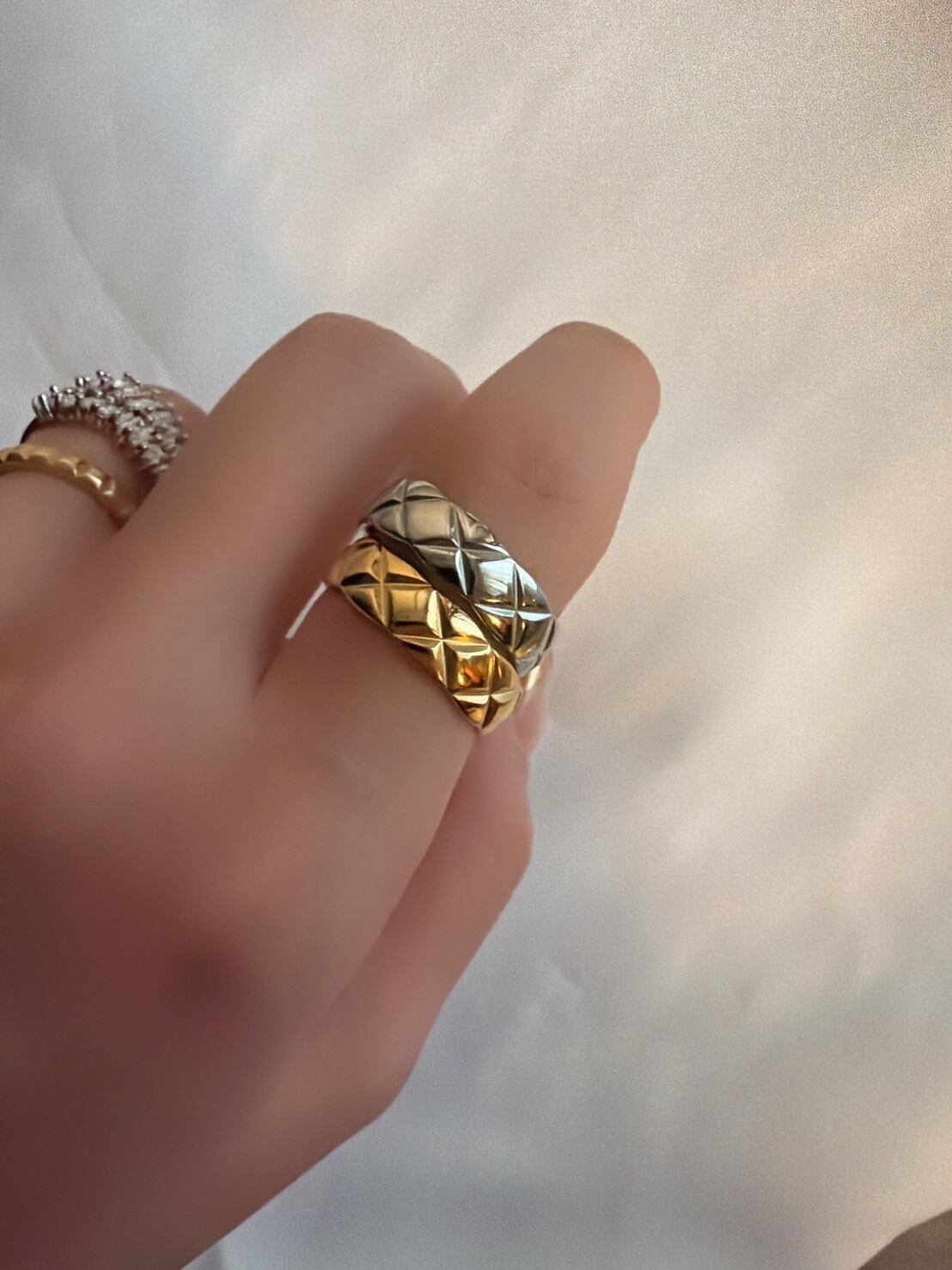 立体的なキルティング模様が目を惹く「キルティングリング」。ふっくらとしたフォルムに施されたクロスカットのデザインが、光を受けるたびに美しく反射し、指先に上品な存在感を与えます。