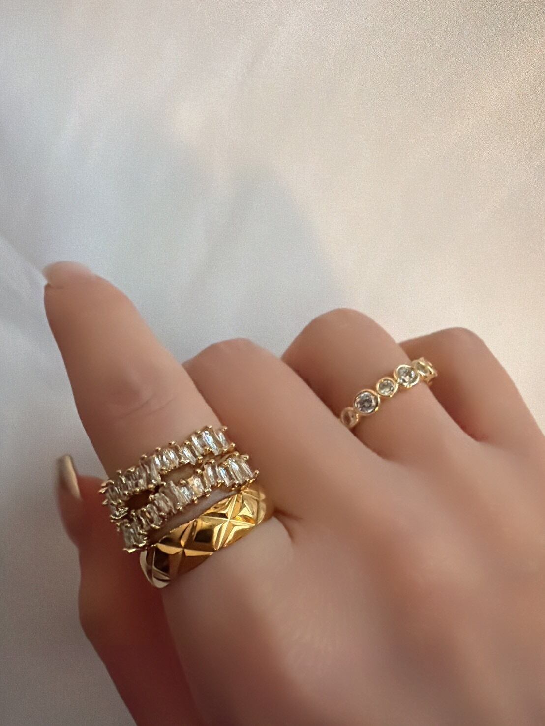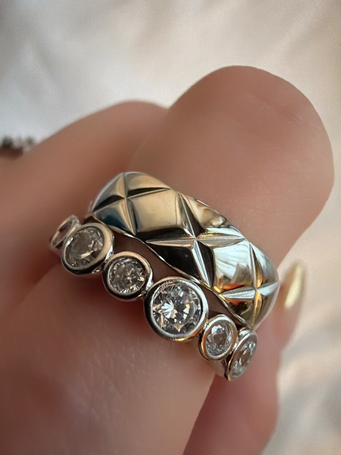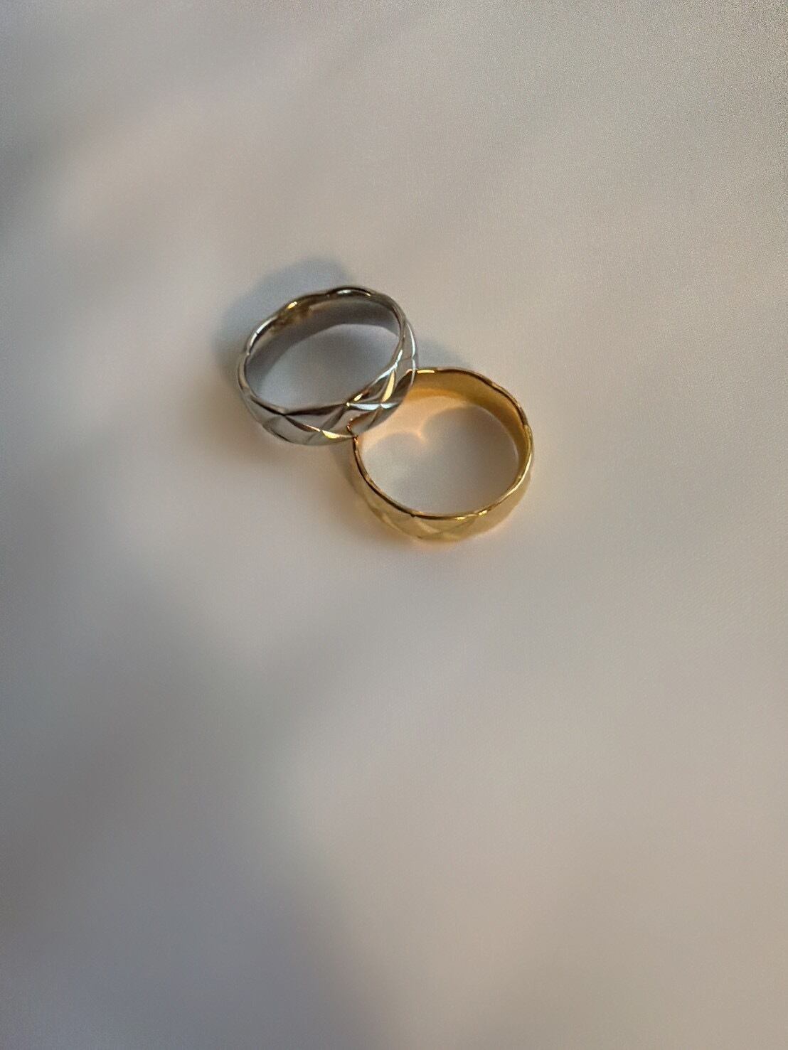 立体的なキルティング模様が目を惹く「キルティングリング」。ふっくらとしたフォルムに施されたクロスカットのデザインが、光を受けるたびに美しく反射し、指先に上品な存在感を与えます。