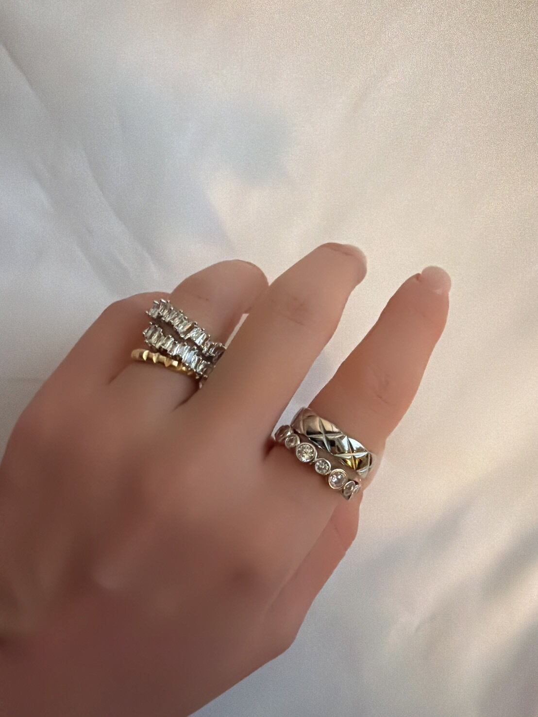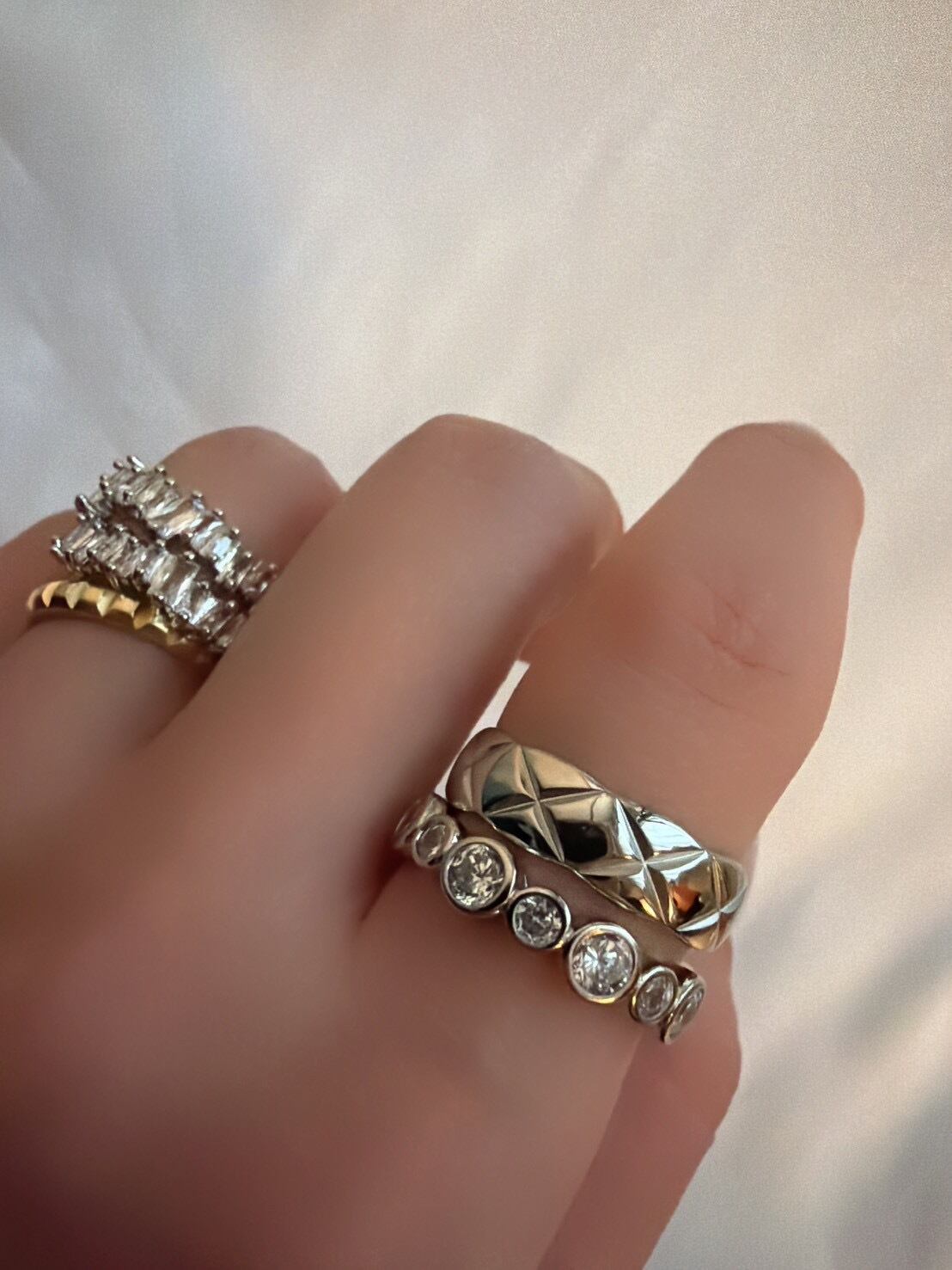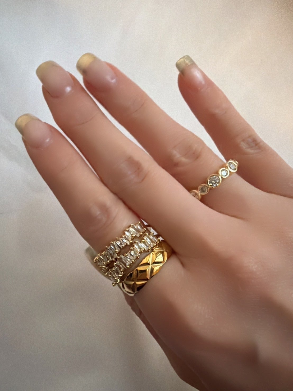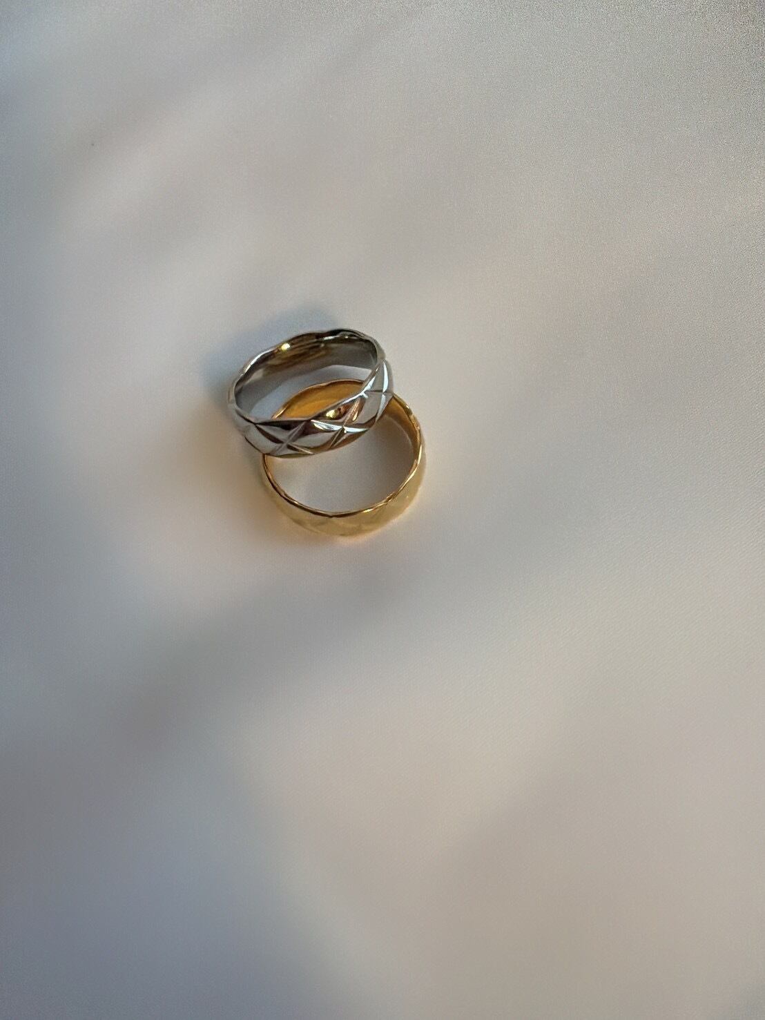 立体的なキルティング模様が目を惹く「キルティングリング」。ふっくらとしたフォルムに施されたクロスカットのデザインが、光を受けるたびに美しく反射し、指先に上品な存在感を与えます。