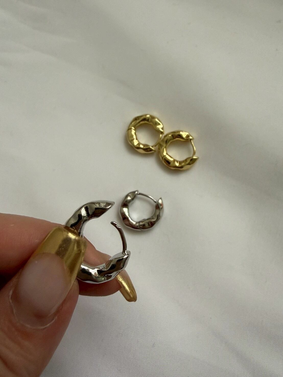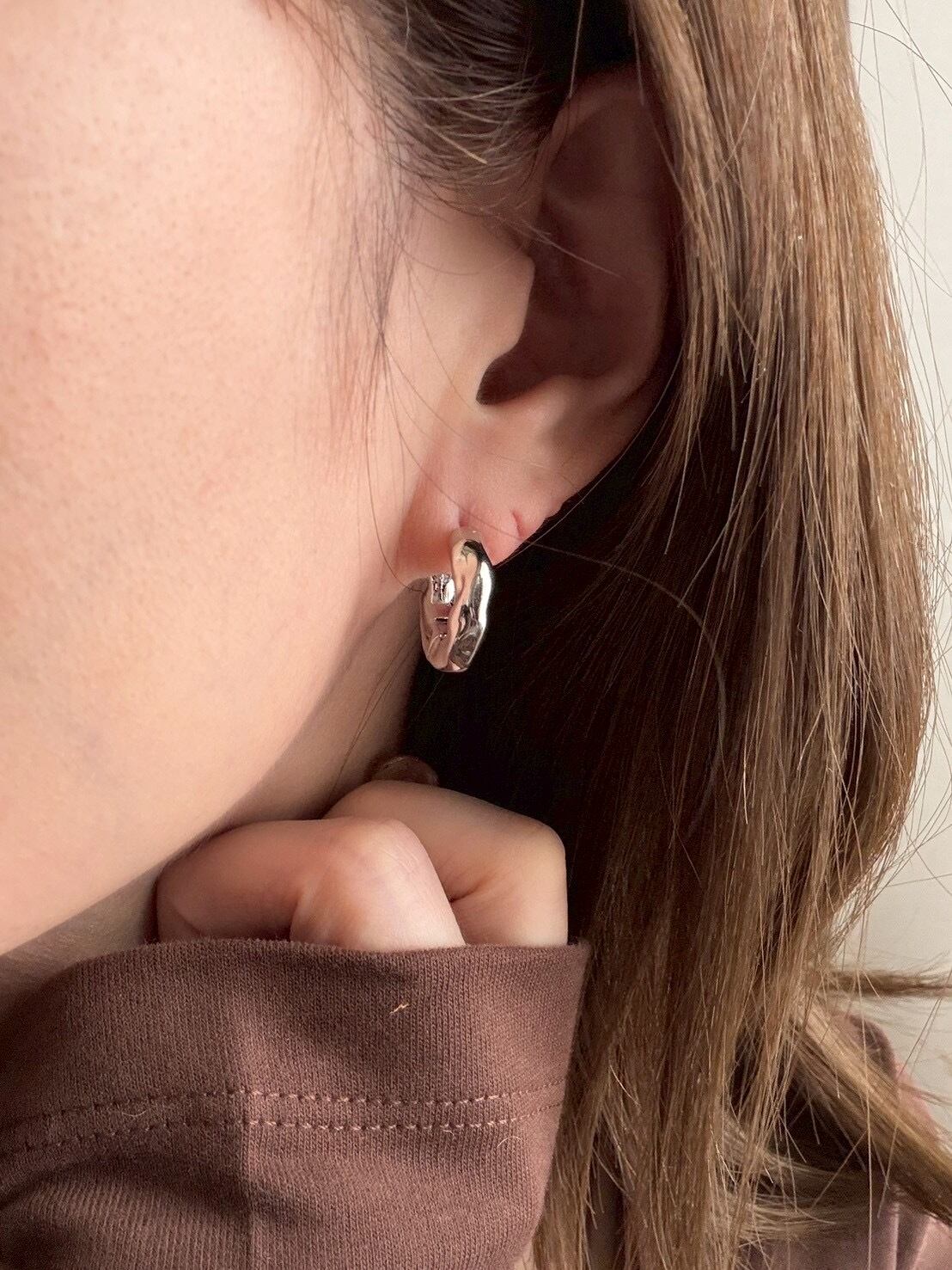 柔らかな光をまとったような質感が魅力の「グロウフープピアス」。なめらかな曲線にニュアンスのある凹凸デザインを施すことで、シンプルなフープに奥行きと立体感をプラス。角度によって変わる光の反射が、耳元に自然な輝きを与えてくれます。