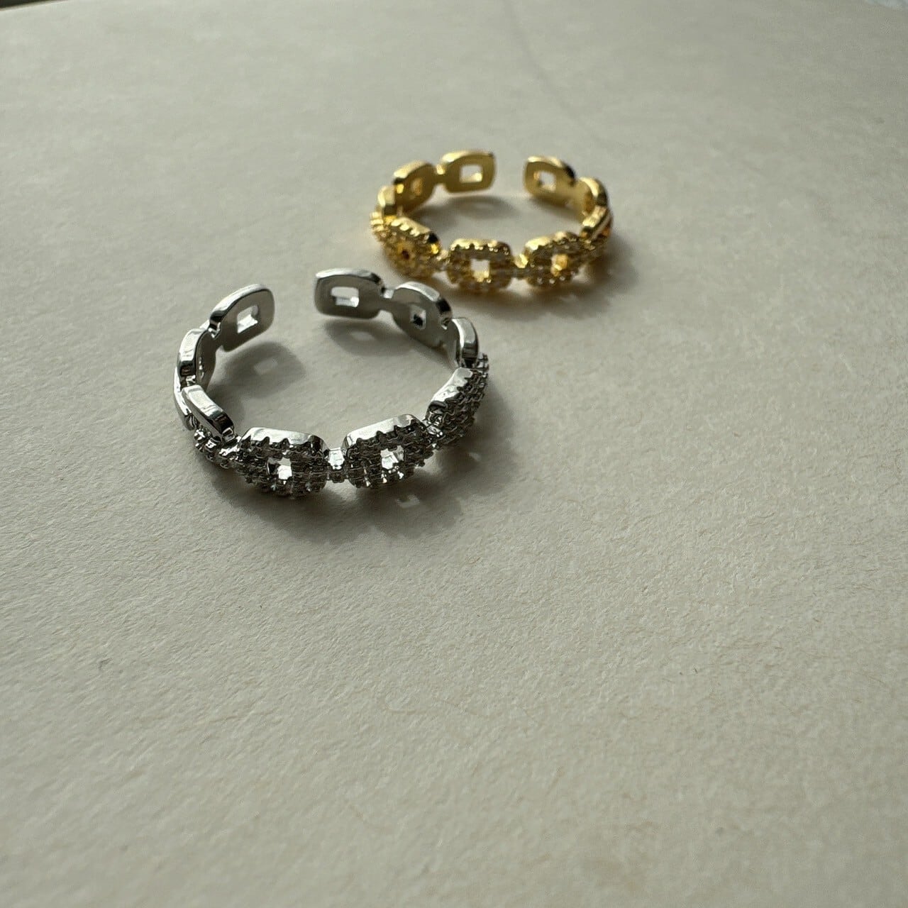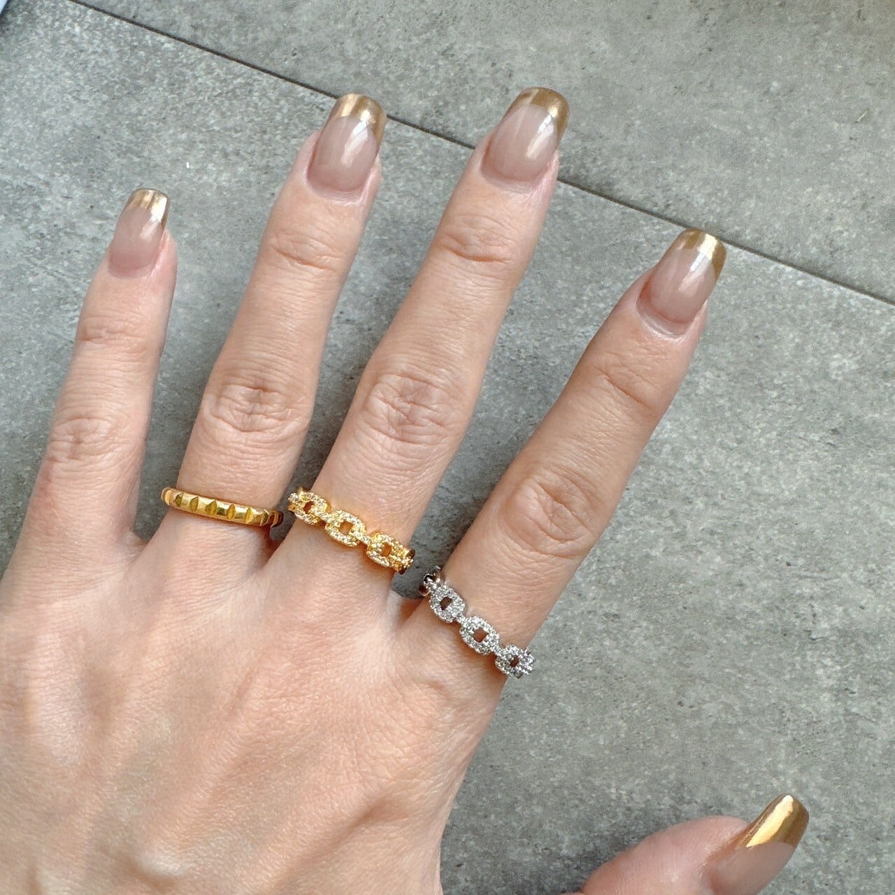 キラキラのチェーンがかわいい♡ widechain ringは、ワイドチェーンと輝くラインストーンがデザインされたリングです。シンプルながらも存在感たっぷりで、華やかさを演出してくれます。